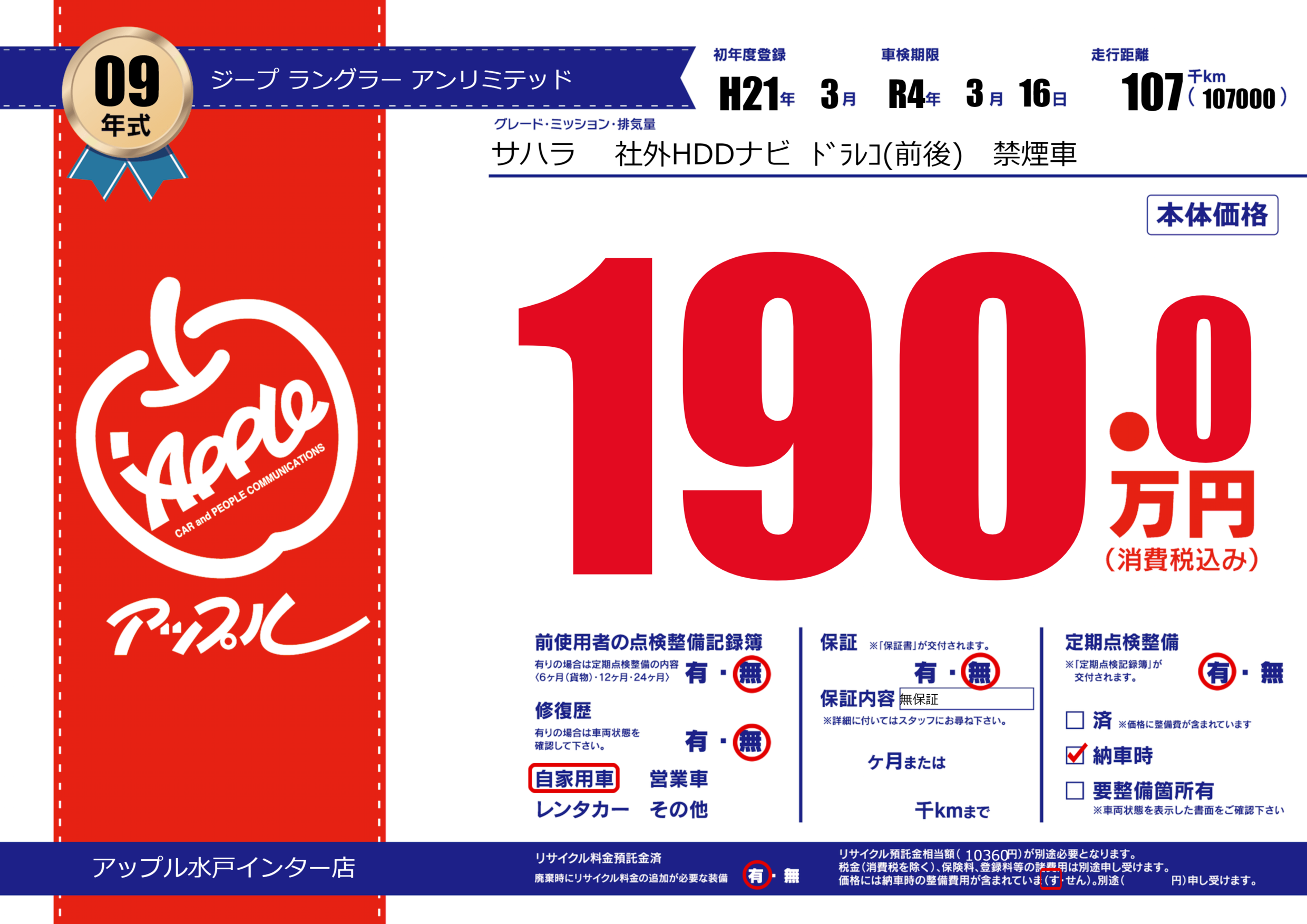 | 車名 | ジープ ラングラー アンリミテッド | グレード ミッション 排気量 |