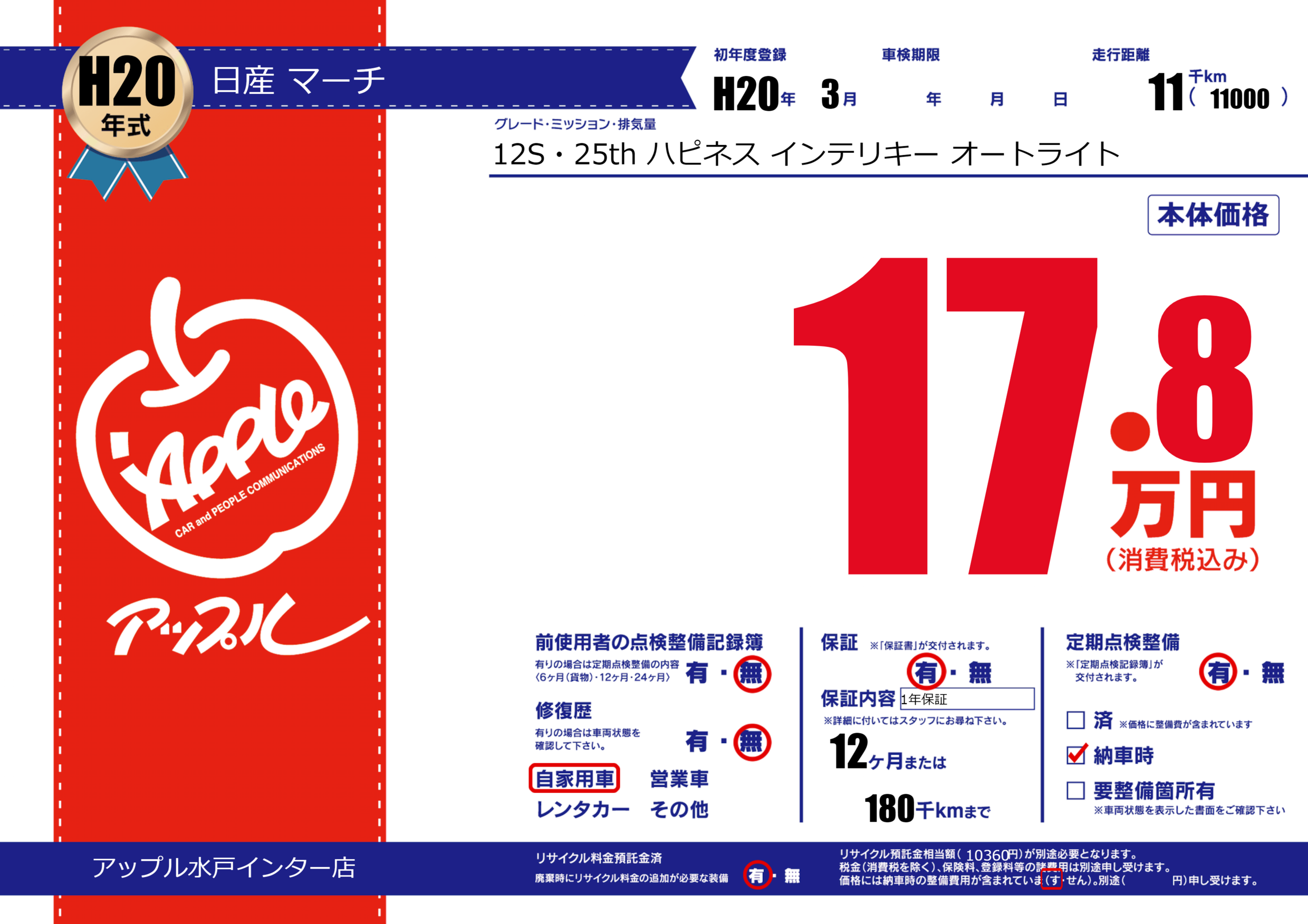 | 車名 | 日産 マーチ | グレード ミッション 排気量 |