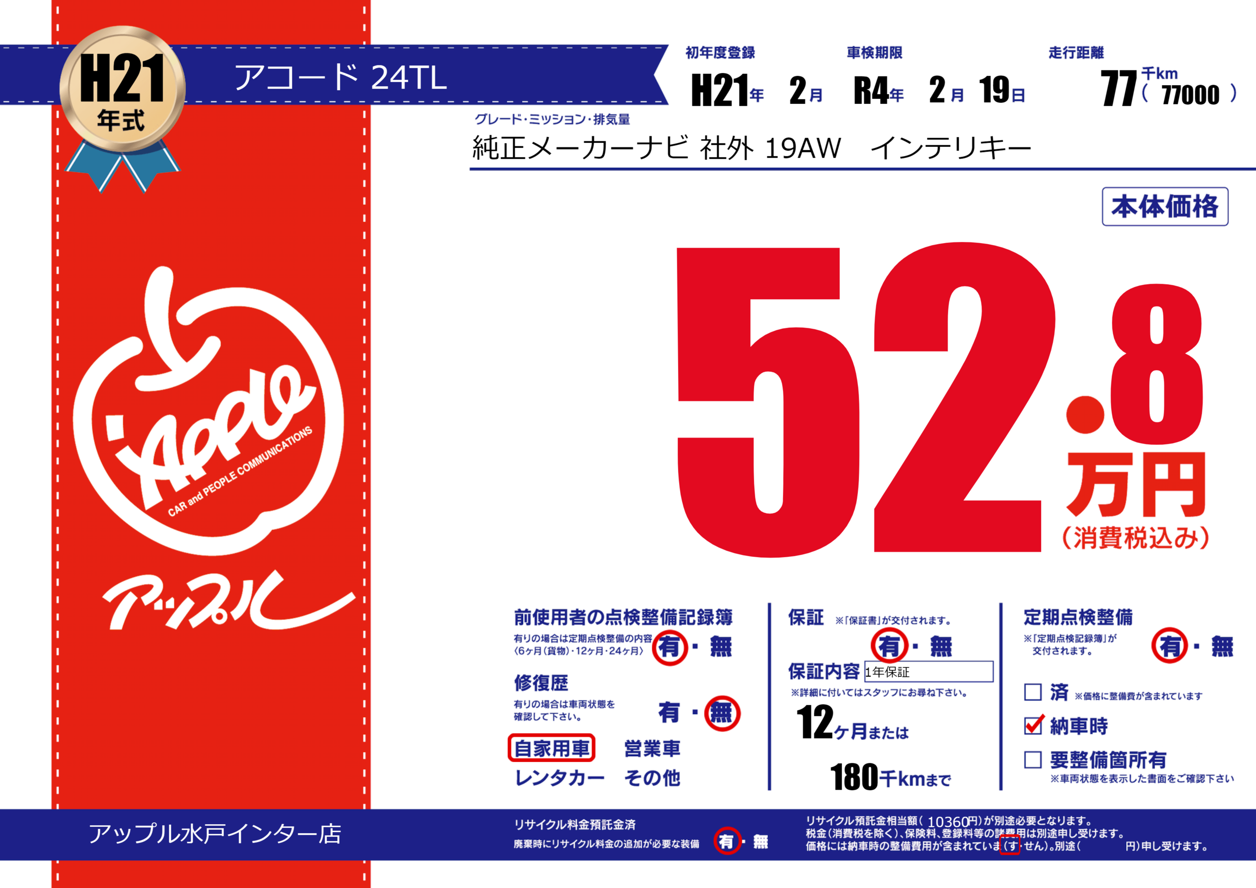 | 車名 | アコード 24TL | グレード ミッション 排気量 |