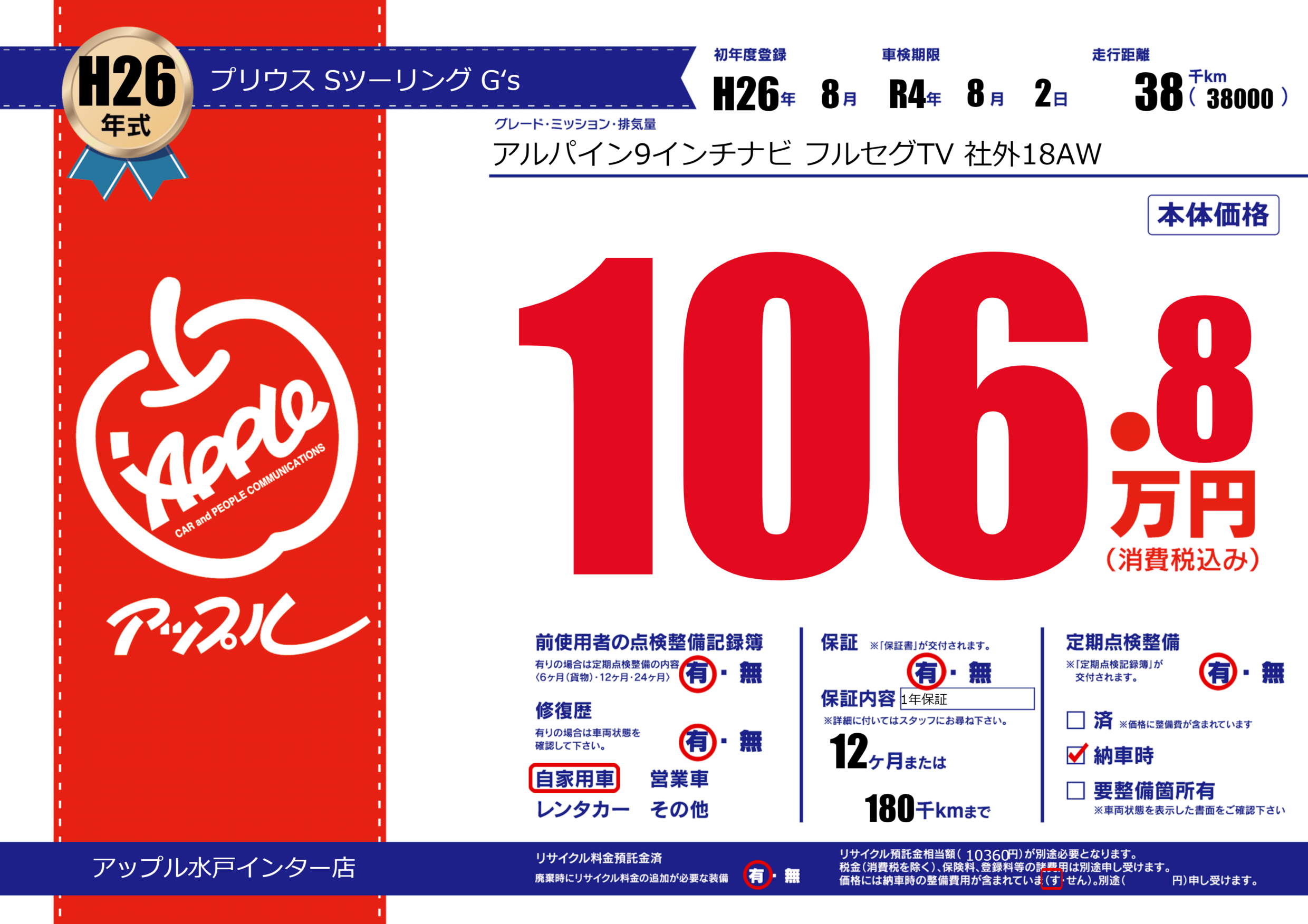| 車名 | プリウス Sツーリング G‘s | グレード ミッション 排気量 |
