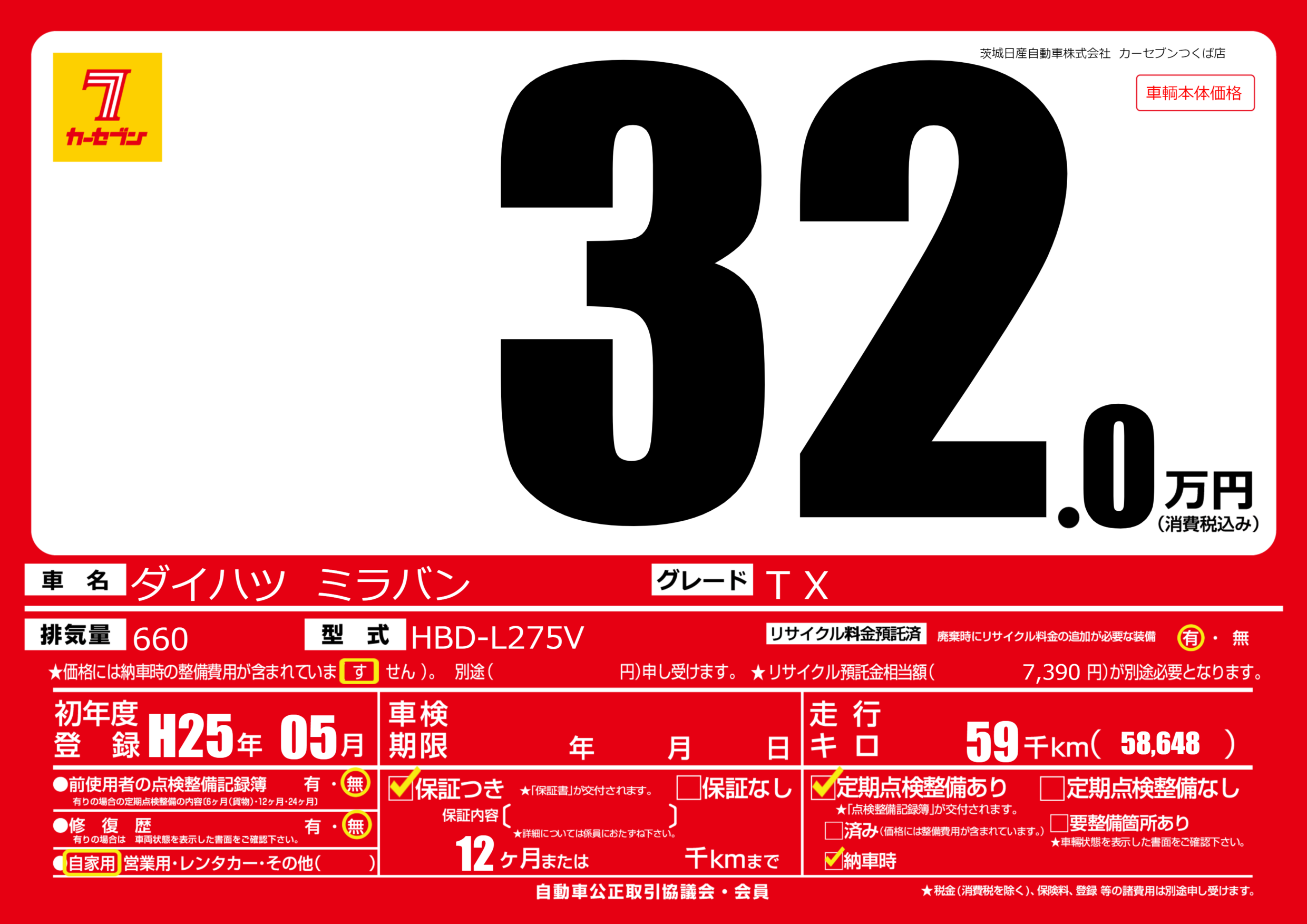 | 車名 | ダイハツ ミラバン | グレード ミッション 排気量 |