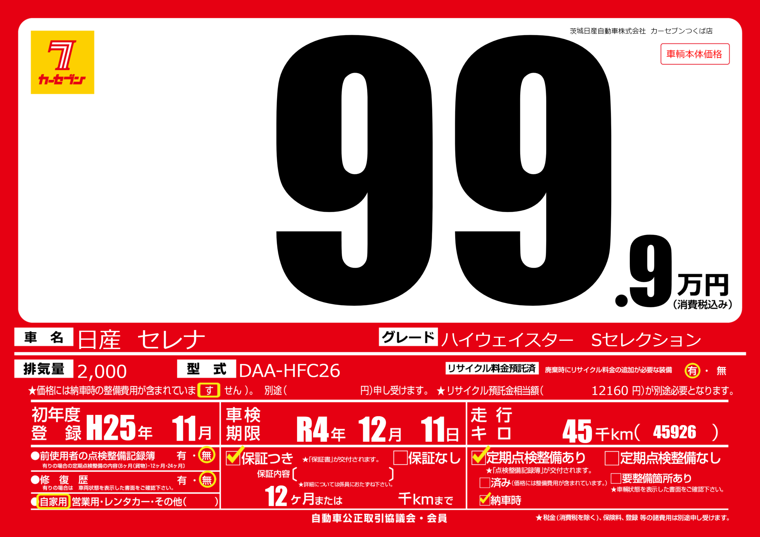 | 定期点検整備 | 定期点検整備あり 納車時あり | ||