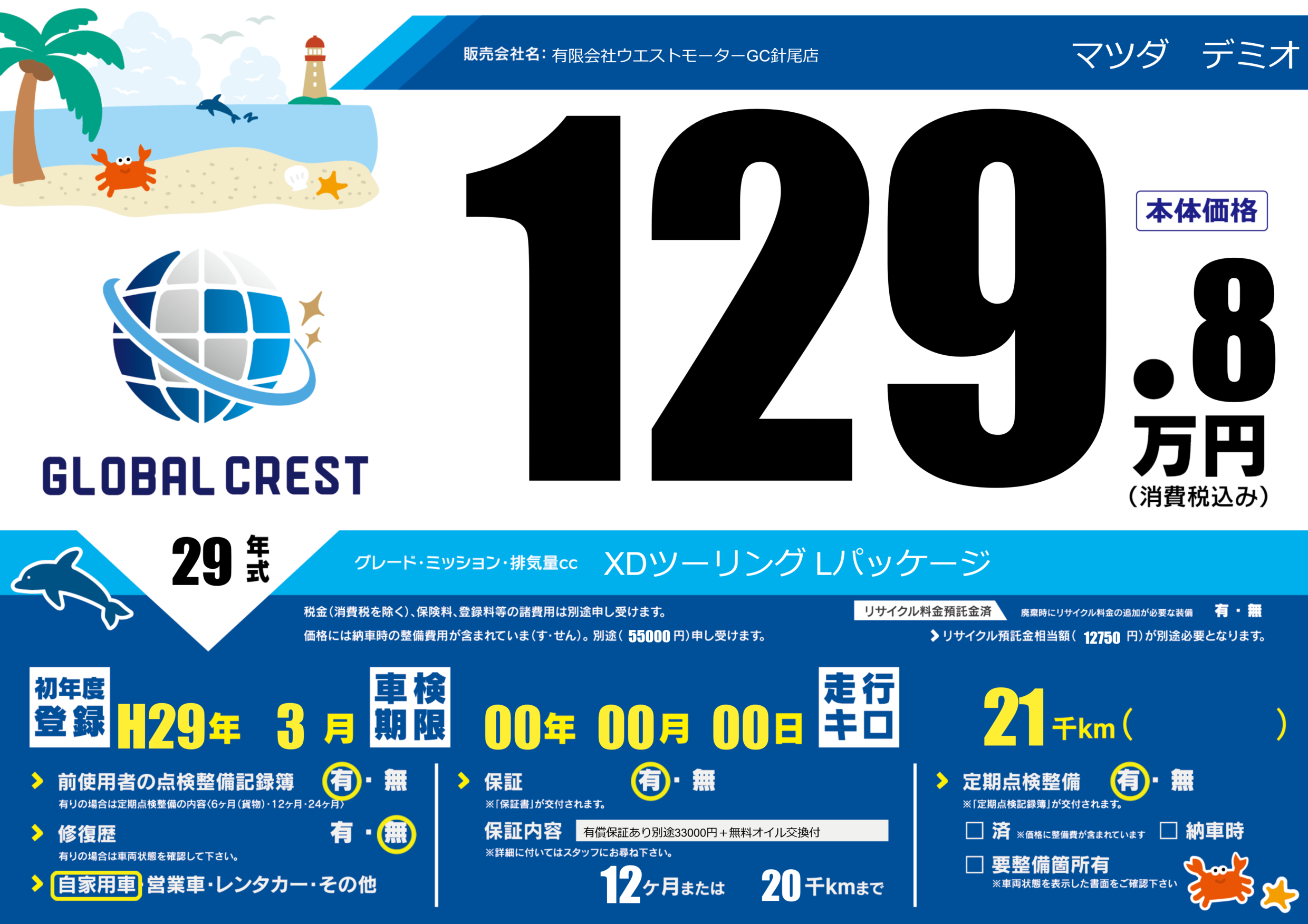 | 走行キロ | 2.1万km | 初年度登録 | H29年3月 |