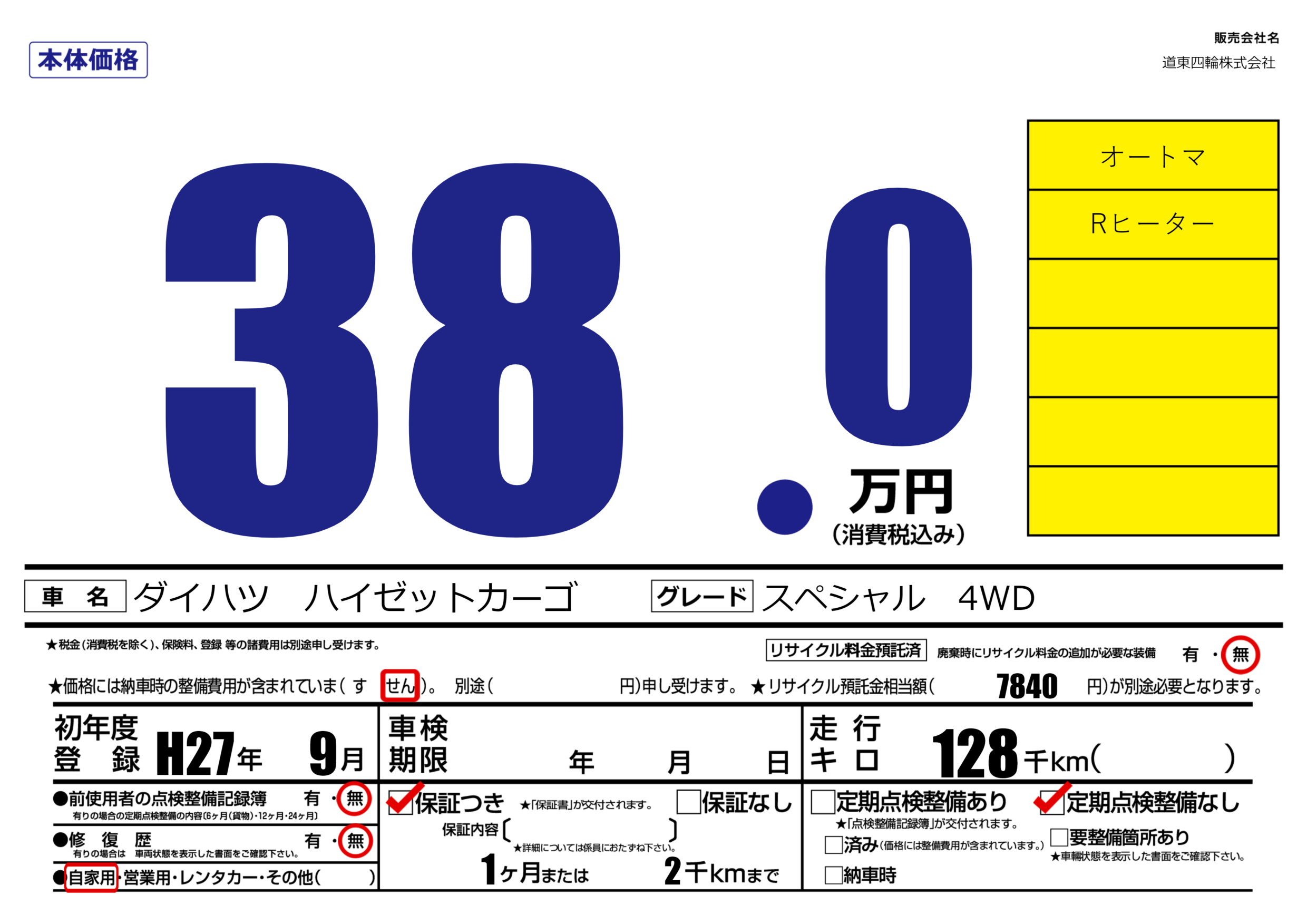 | 車名 | ダイハツ ハイゼットカーゴ | グレード ミッション 排気量 |
