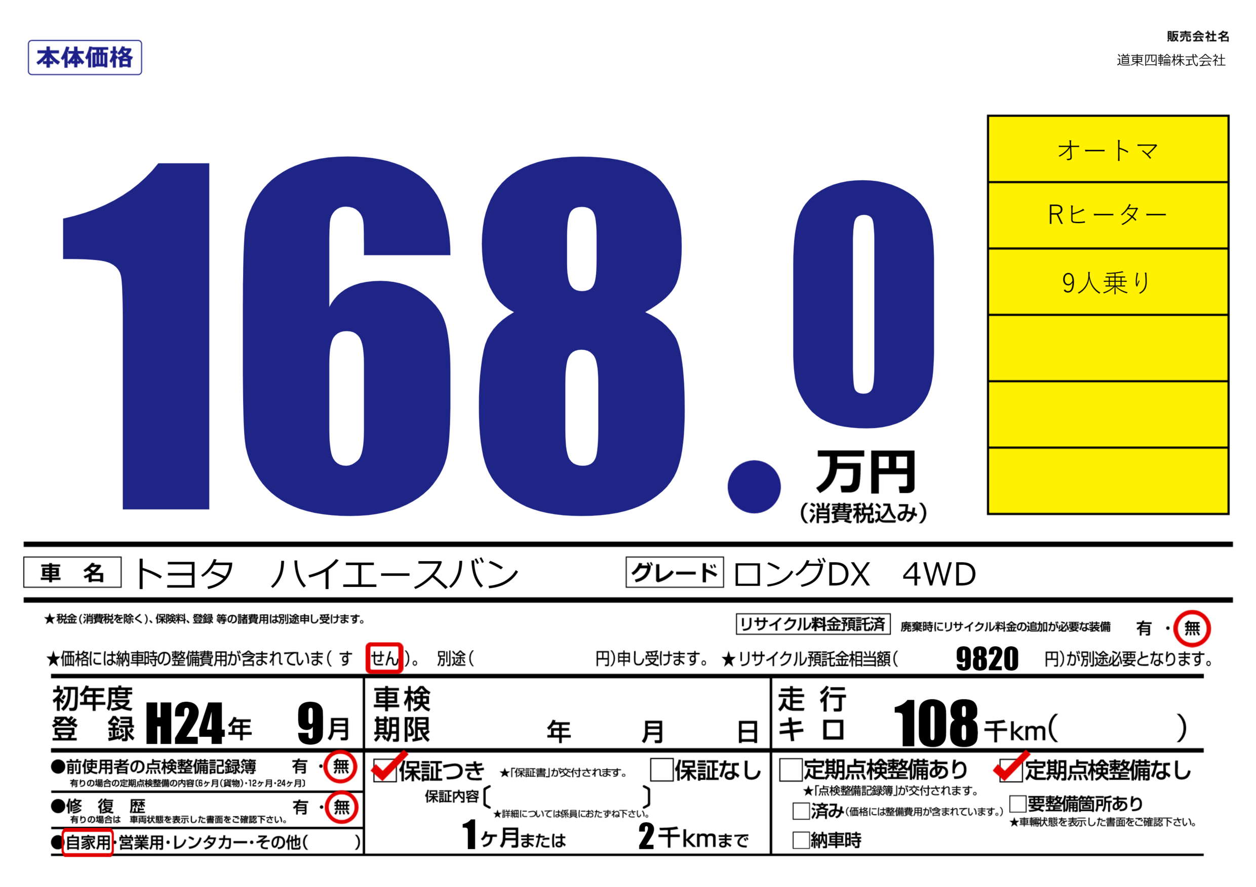 | 車名 | トヨタ ハイエースバン | グレード ミッション 排気量 |