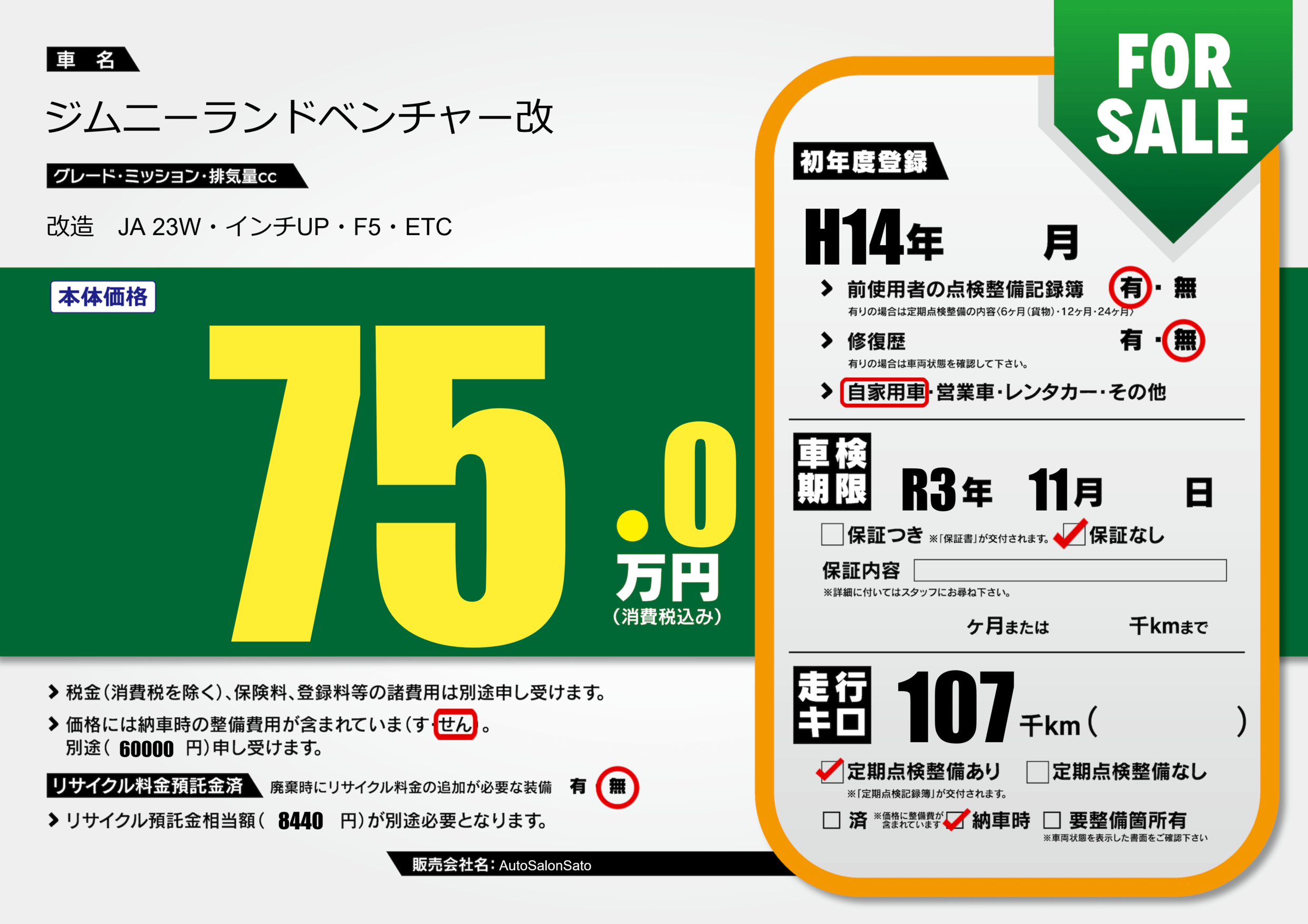 | 車名 | ジムニーランドベンチャー改 | グレード ミッション 排気量 |