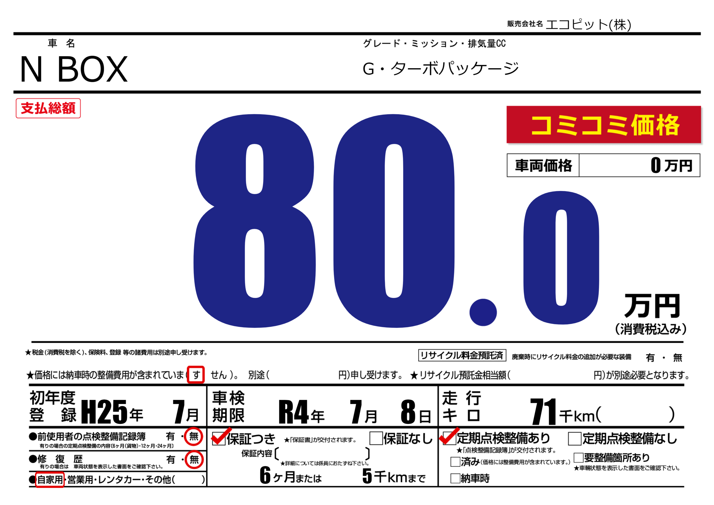 | 車名 | N BOX | グレード ミッション 排気量 |
