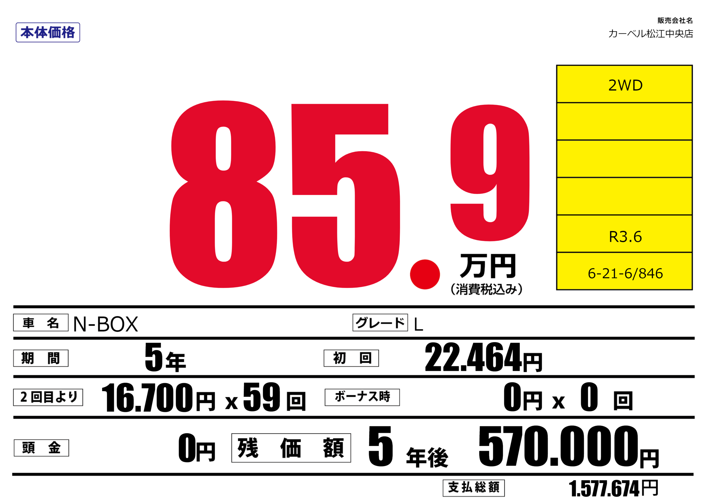 | 車名 | N-BOX | グレード ミッション 排気量 |