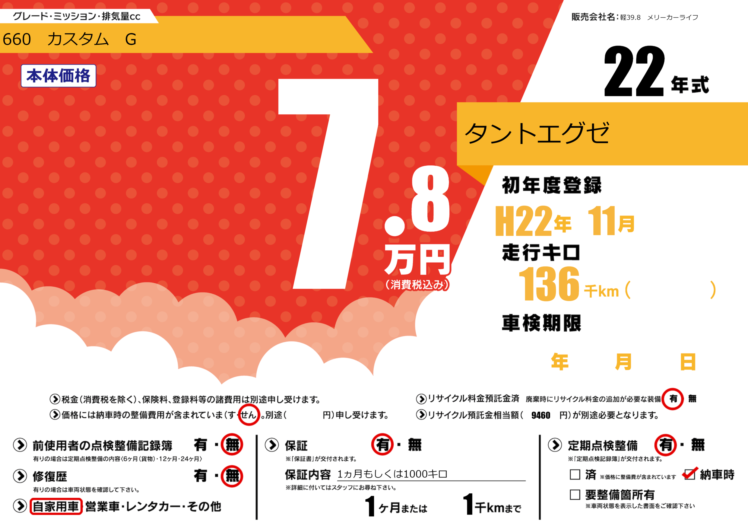 | 定期点検整備 | 定期点検整備あり 納車時あり | ||