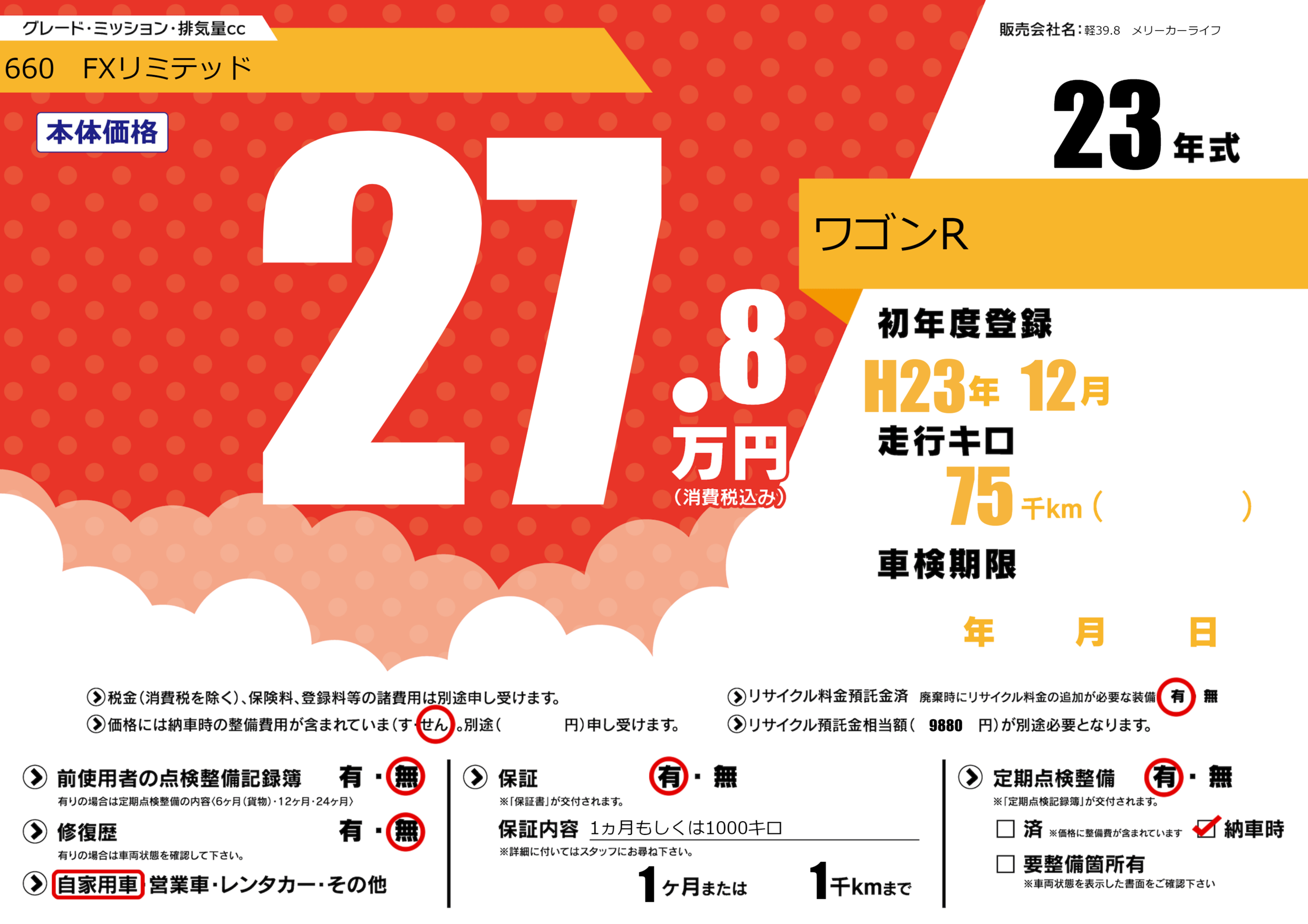 | 走行キロ | 7.5万km | 初年度登録 | H23年12月 |