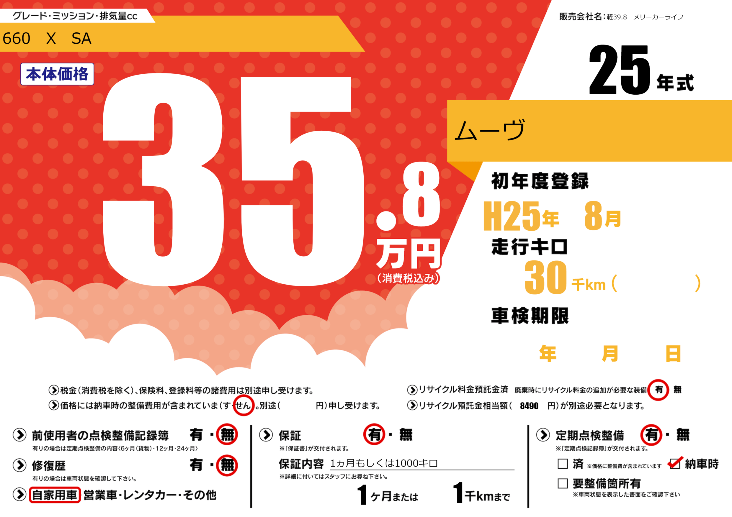 | 走行キロ | 3万km | 初年度登録 | H25年8月 |