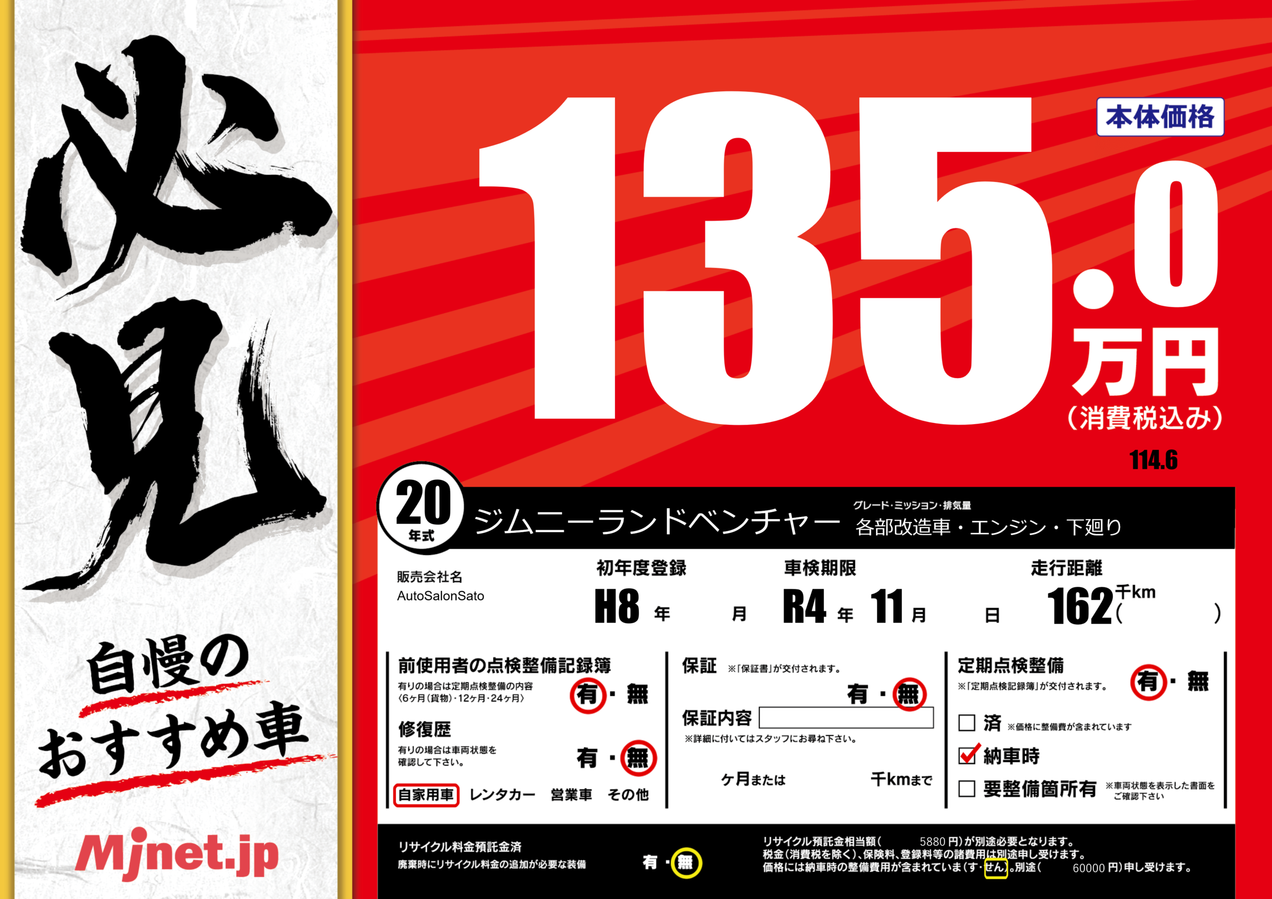 | 車名 | ジムニーランドベンチャー | グレード ミッション 排気量 |