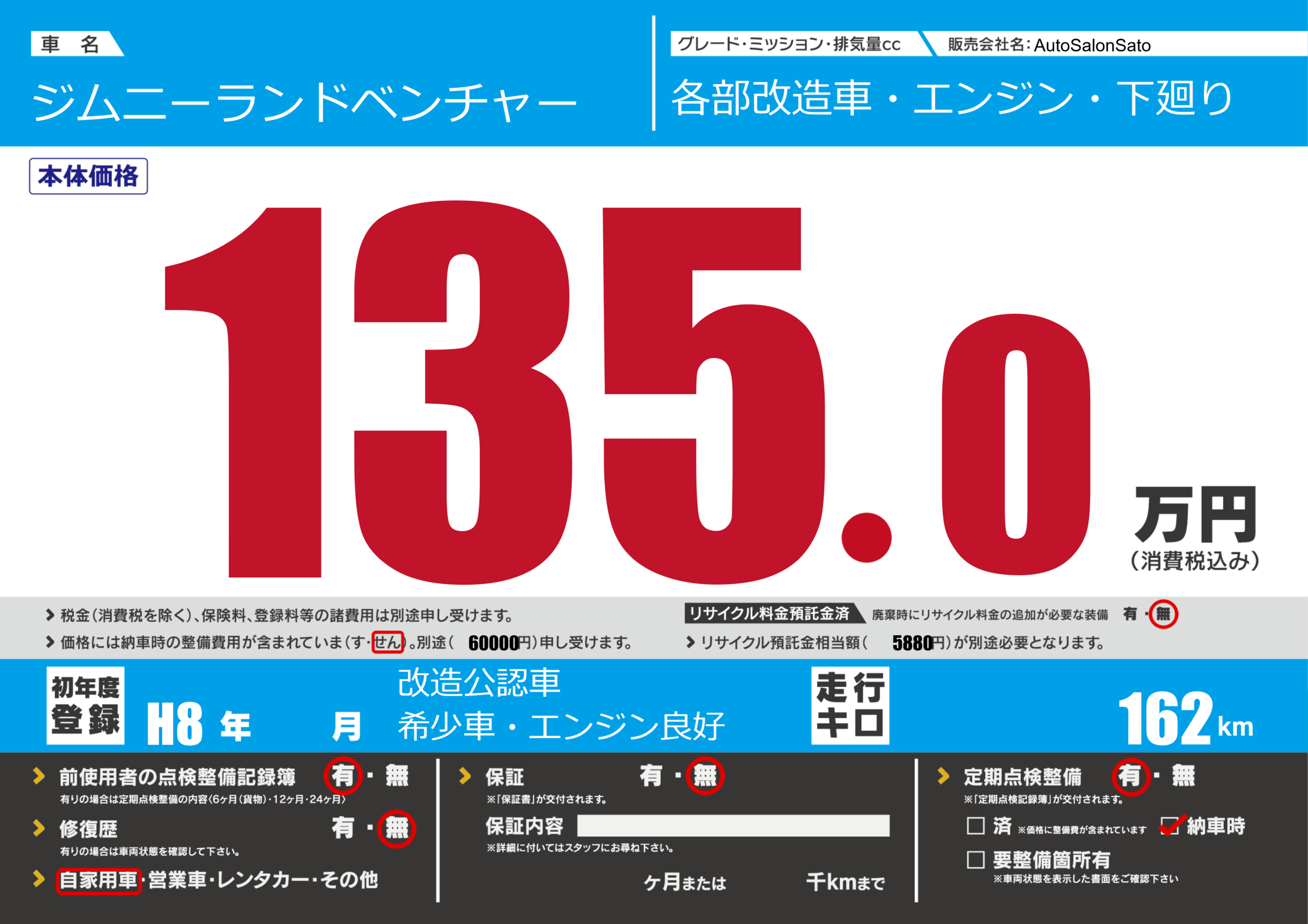 | 走行キロ | 16.2万km | 初年度登録 | H8年---月 |