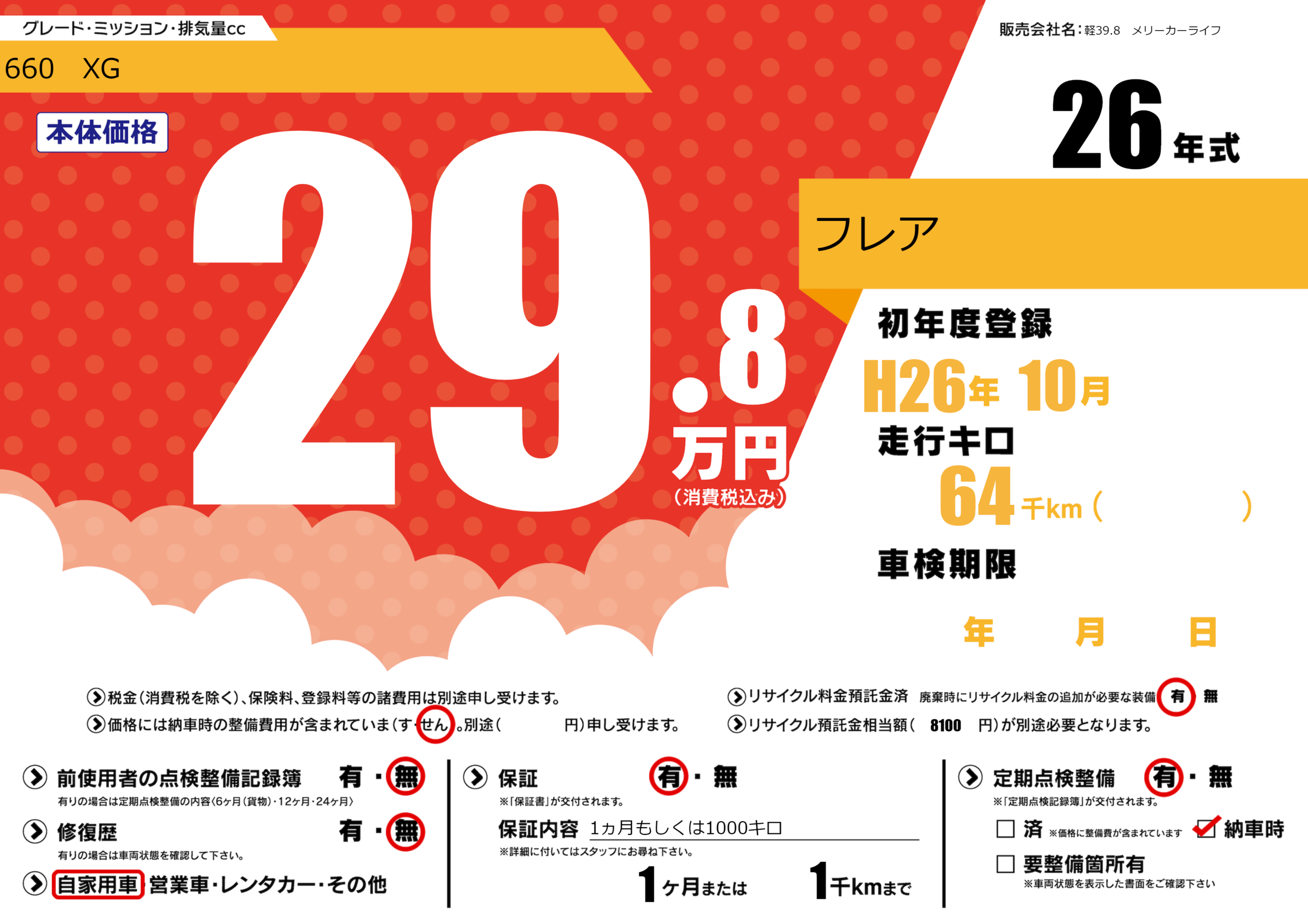 | 定期点検整備 | 定期点検整備あり 納車時あり | ||