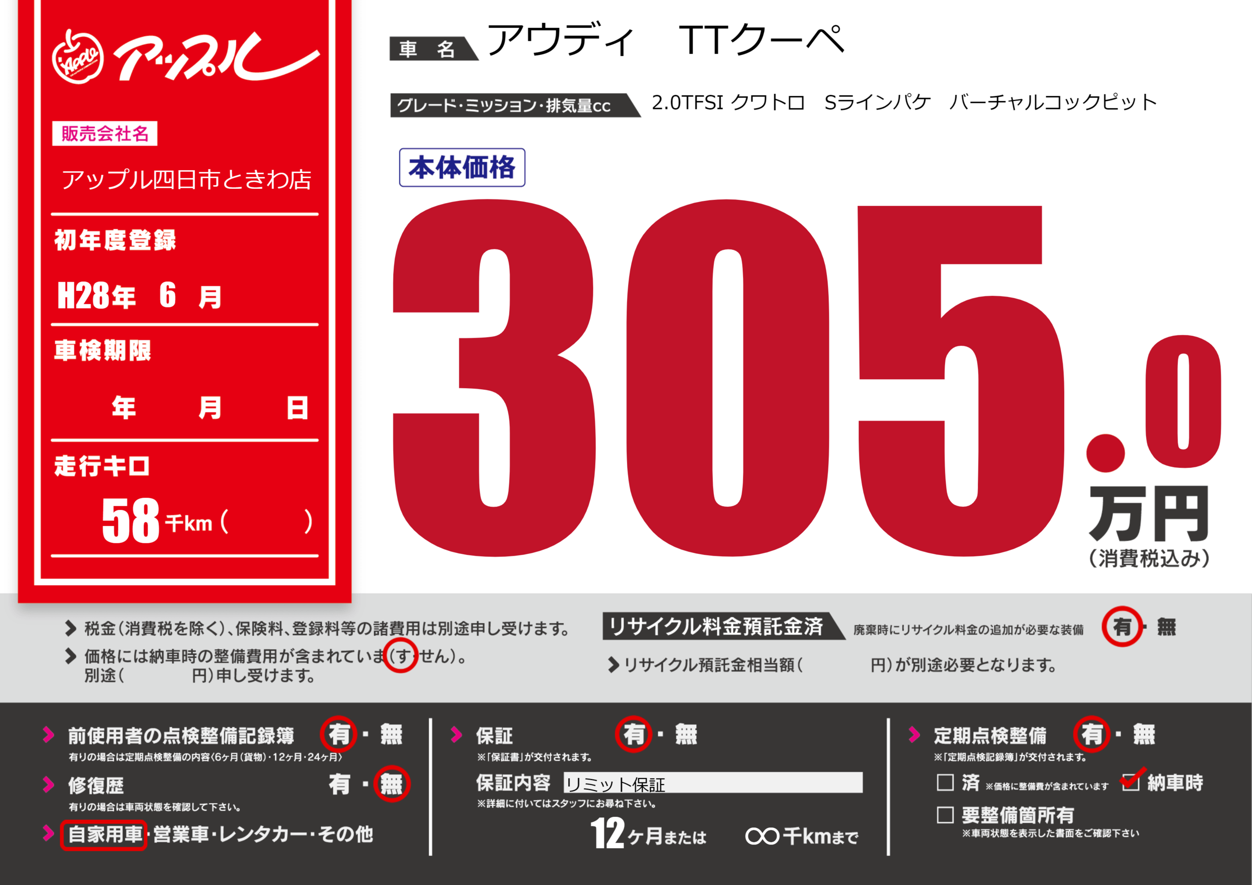 | 車名 | アウディ TTクーペ | グレード ミッション 排気量 |