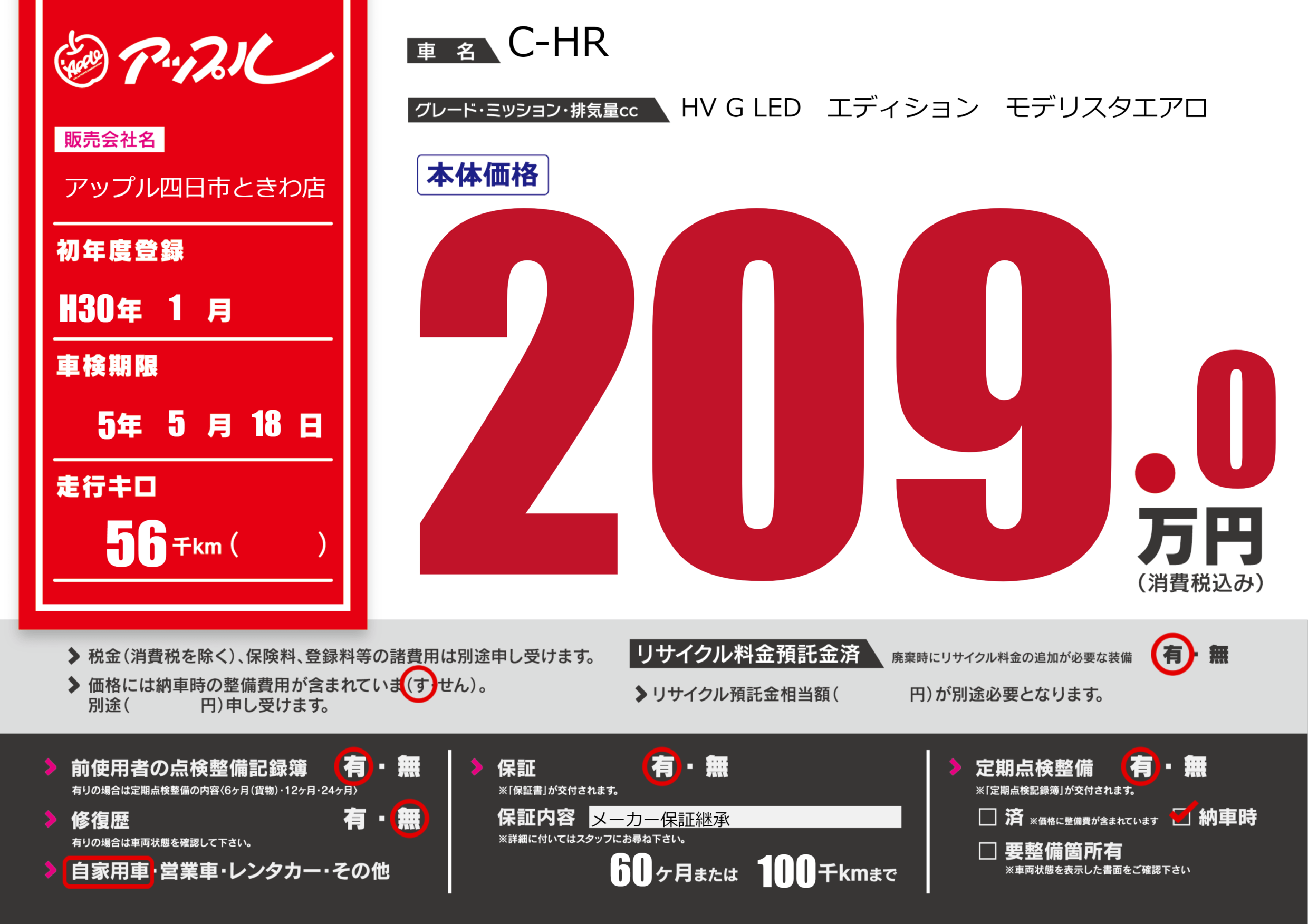 | 車名 | C-HR | グレード ミッション 排気量 |