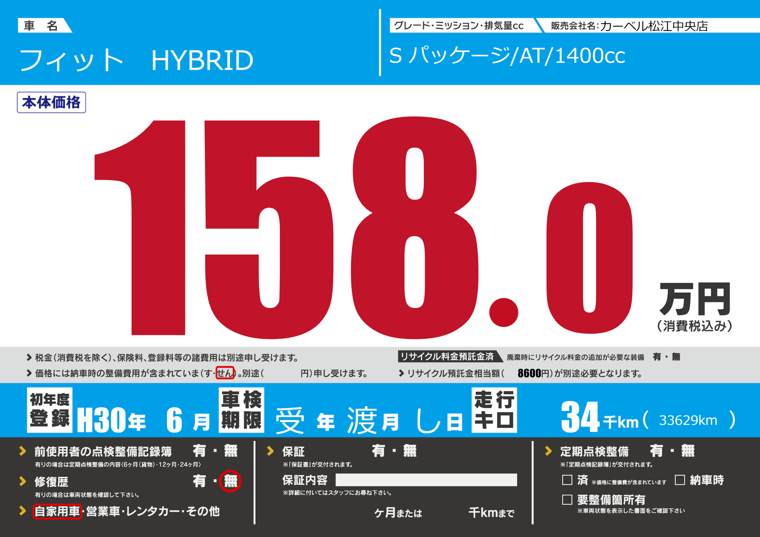 | 車名 | フィット HYBRID | グレード ミッション 排気量 |