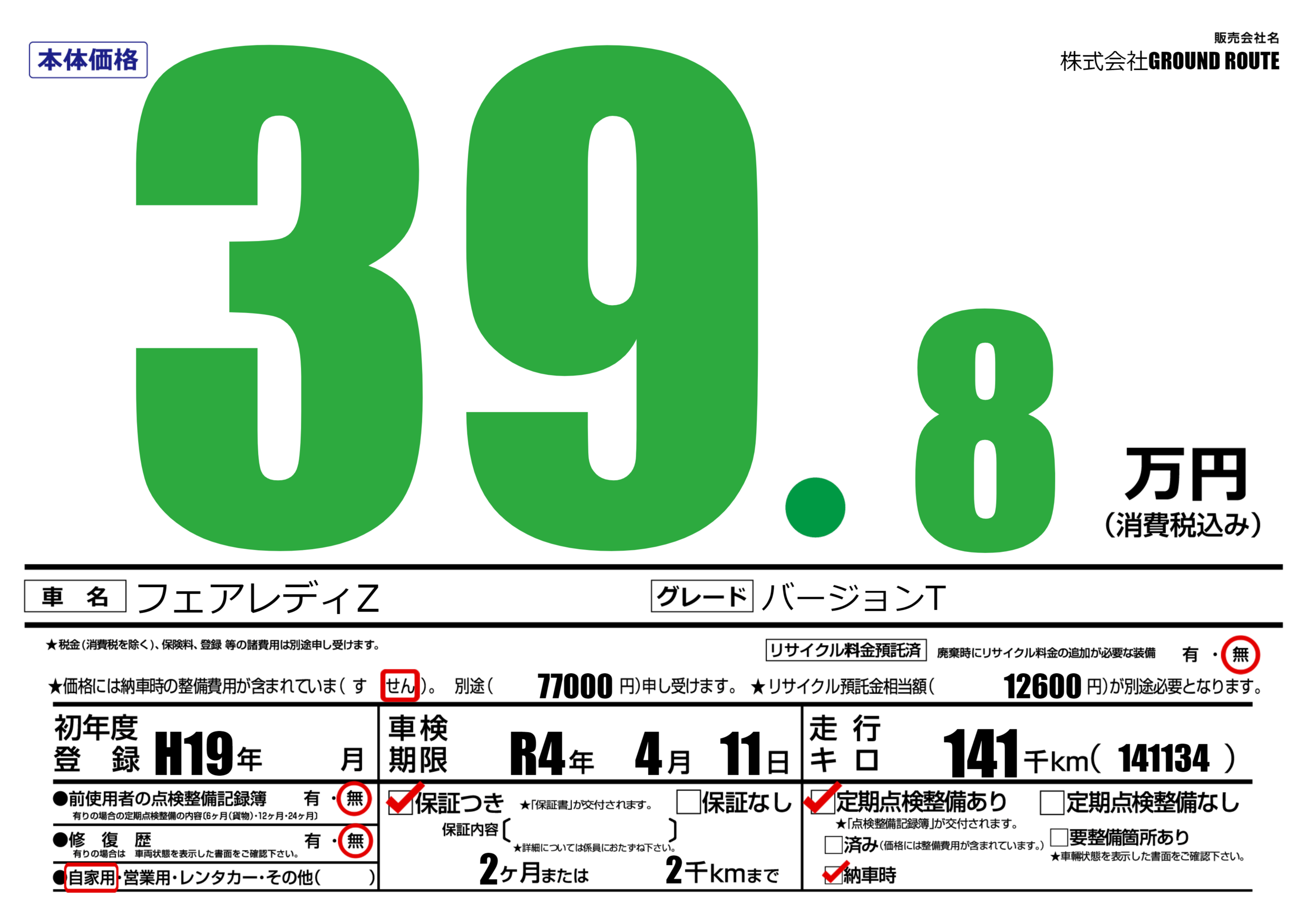 | 定期点検整備 | 定期点検整備あり 納車時あり | ||