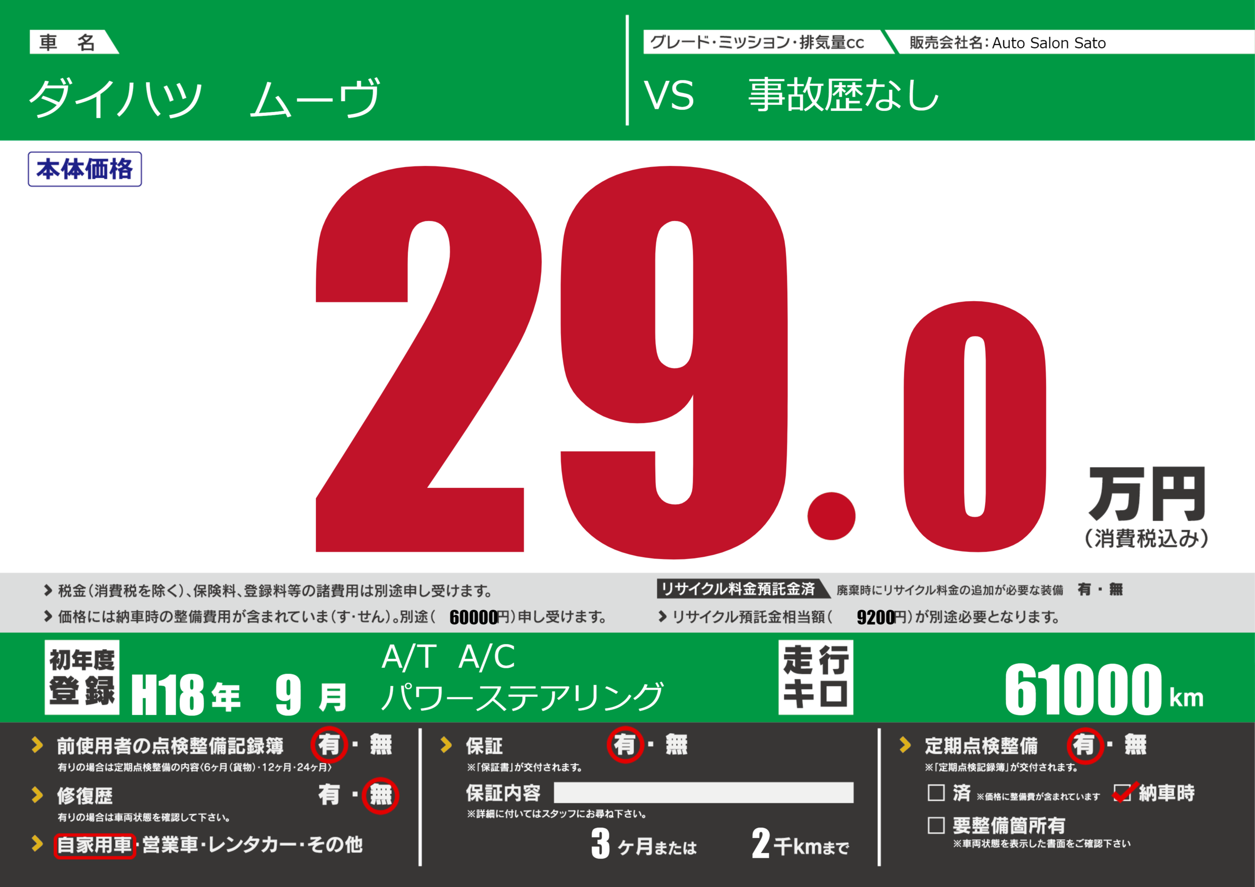 | 車名 | ダイハツ ムーヴ | グレード ミッション 排気量 |