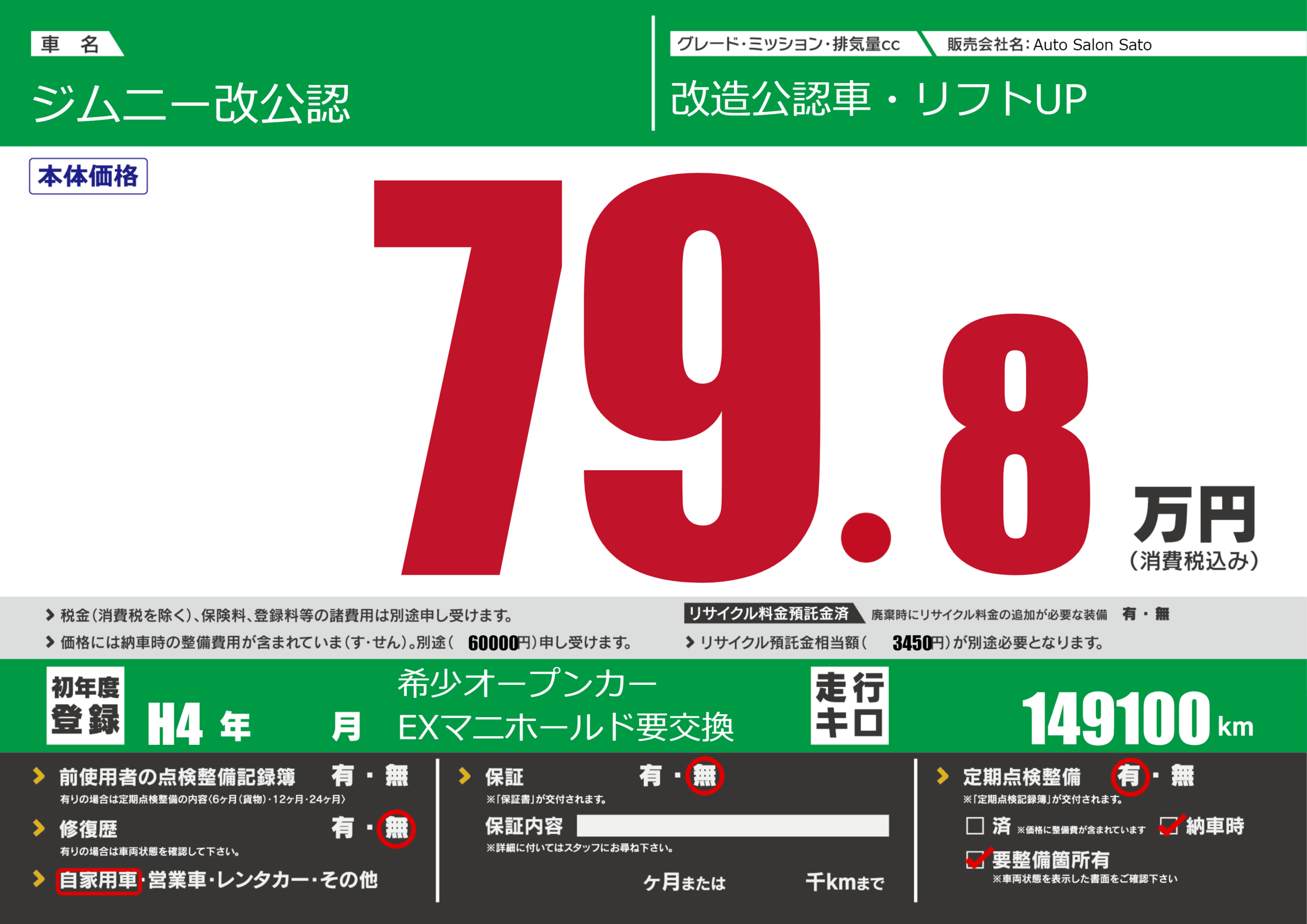 | 車名 | ジムニー改公認 | グレード ミッション 排気量 |