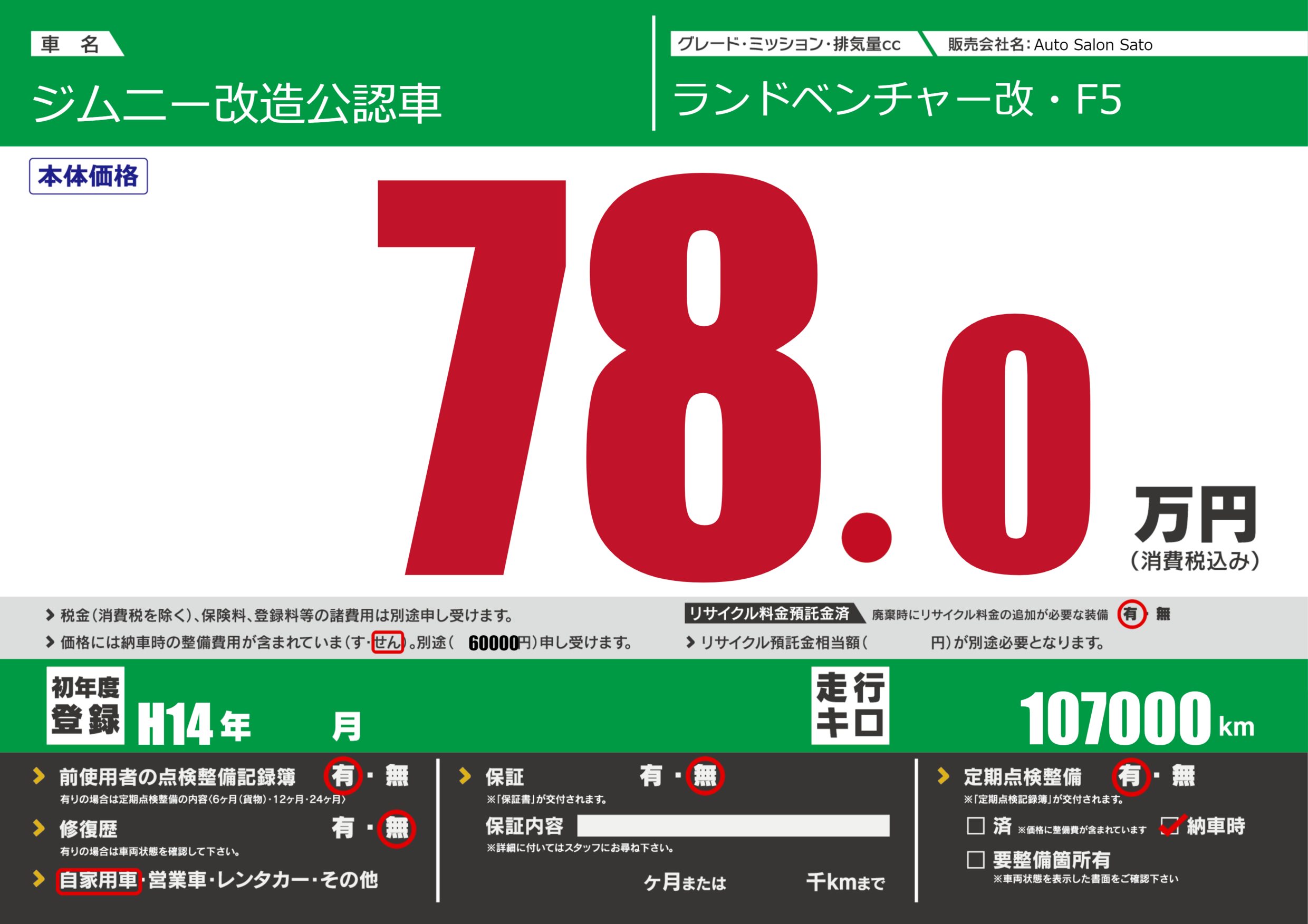 | 車名 | ジムニー改造公認車 | グレード ミッション 排気量 |
