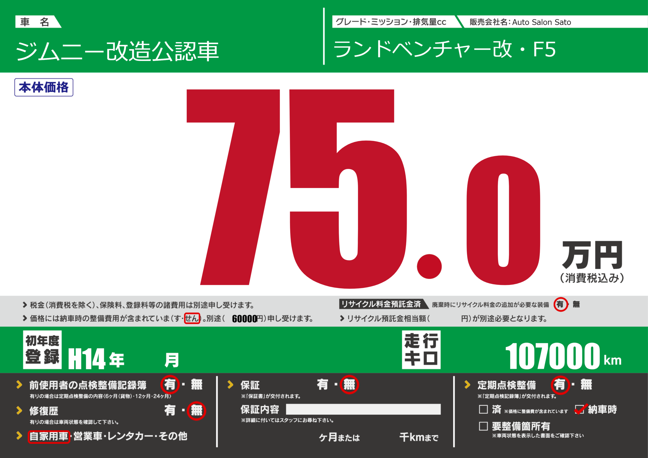 | 車名 | ジムニー改造公認車 | グレード ミッション 排気量 |