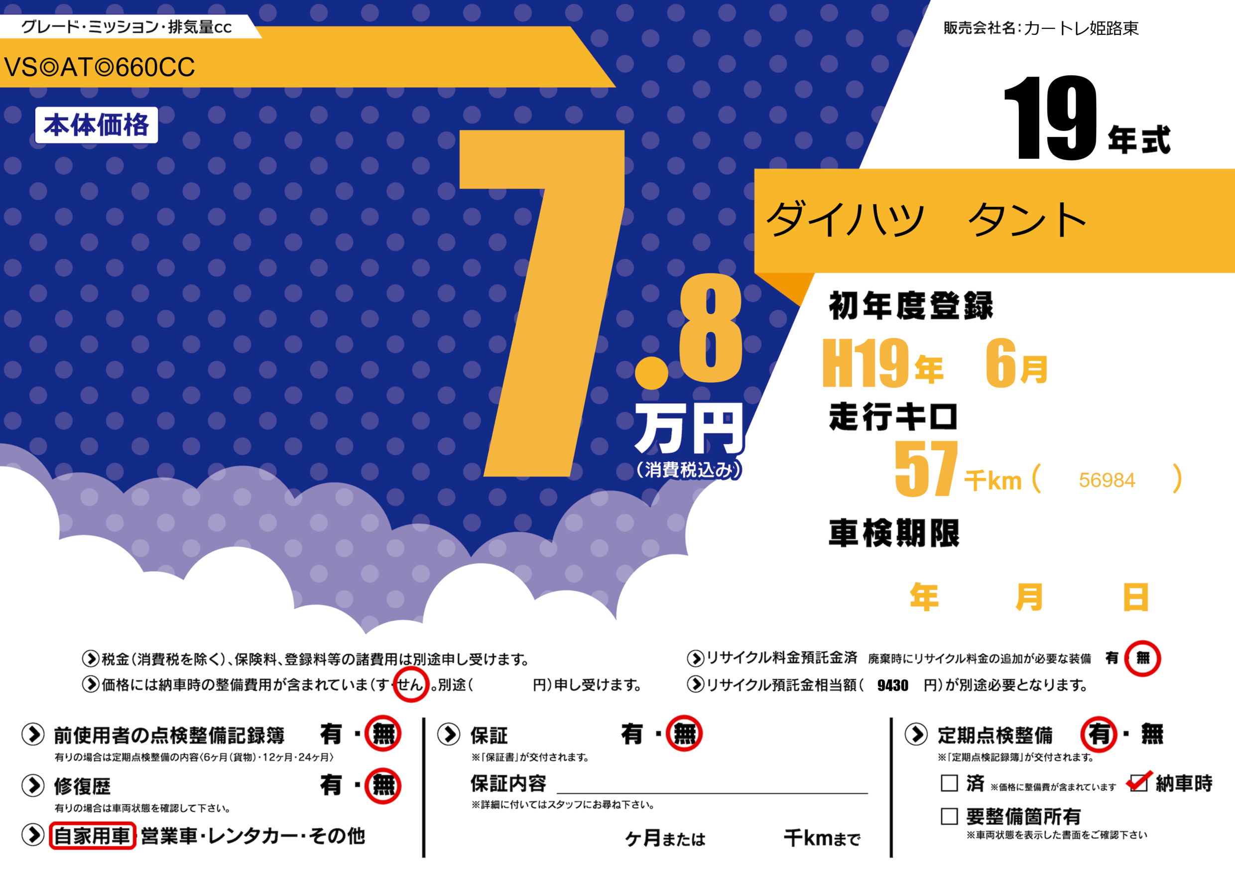 | 車名 | ダイハツ タント | グレード ミッション 排気量 |