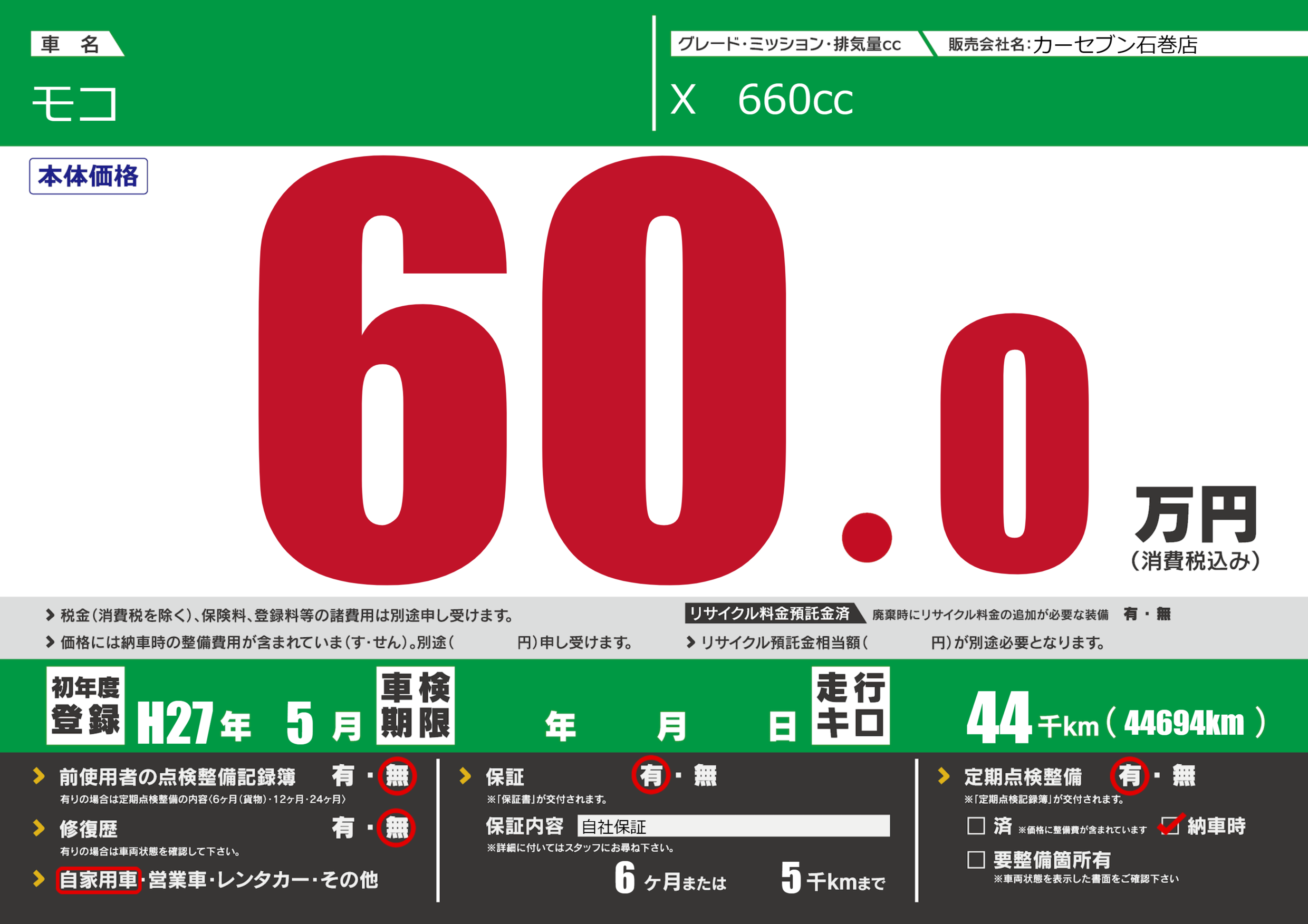保証付き 保証内容(自社保証) 6ヶ月または5千km |