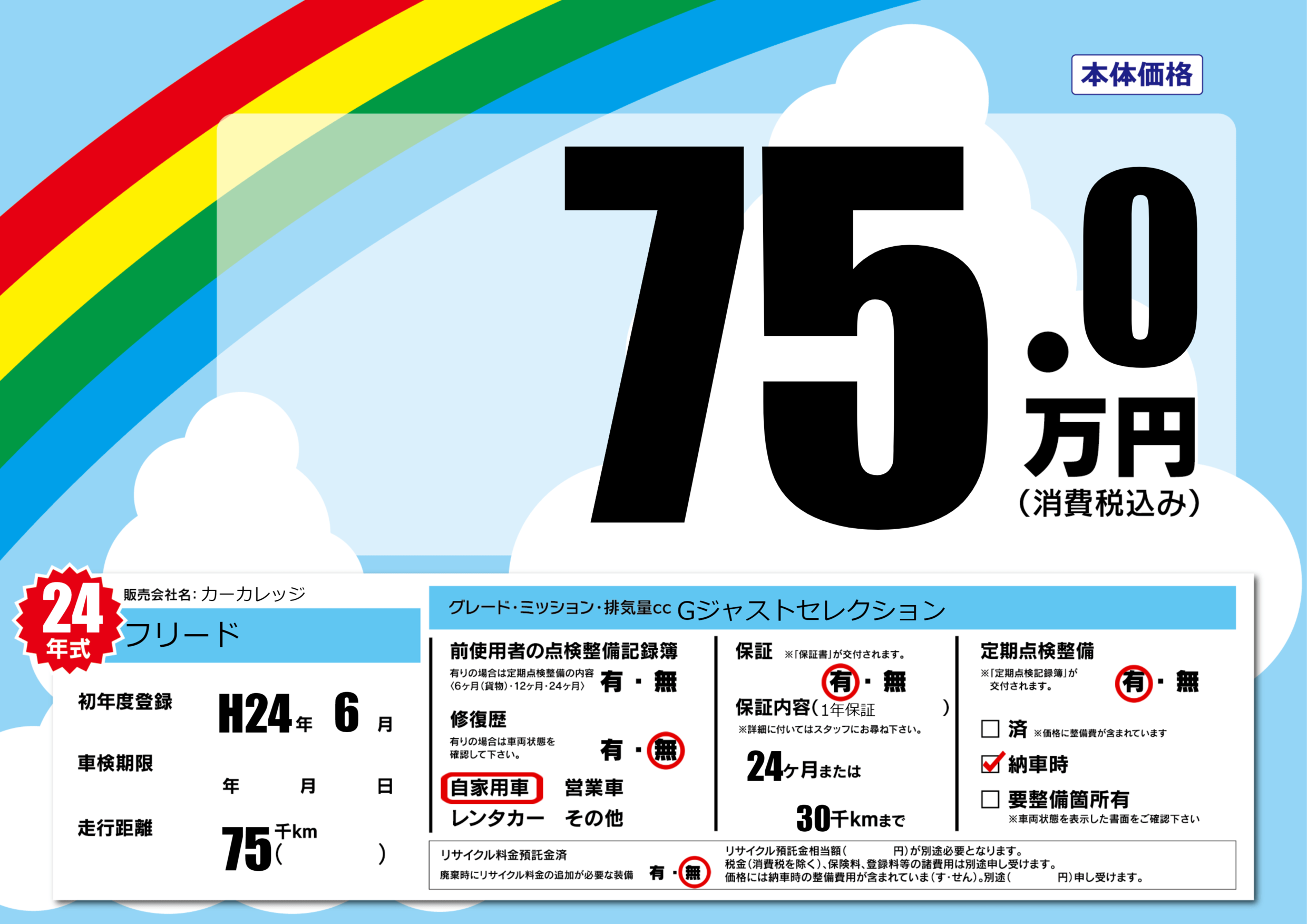 | 走行キロ | 7.5万km | 初年度登録 | H24年6月 |