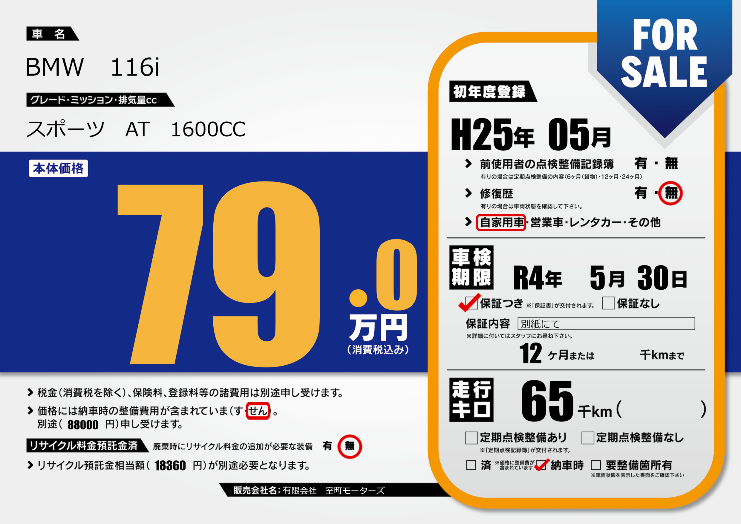 | 車名 | BMW 116i | グレード ミッション 排気量 |