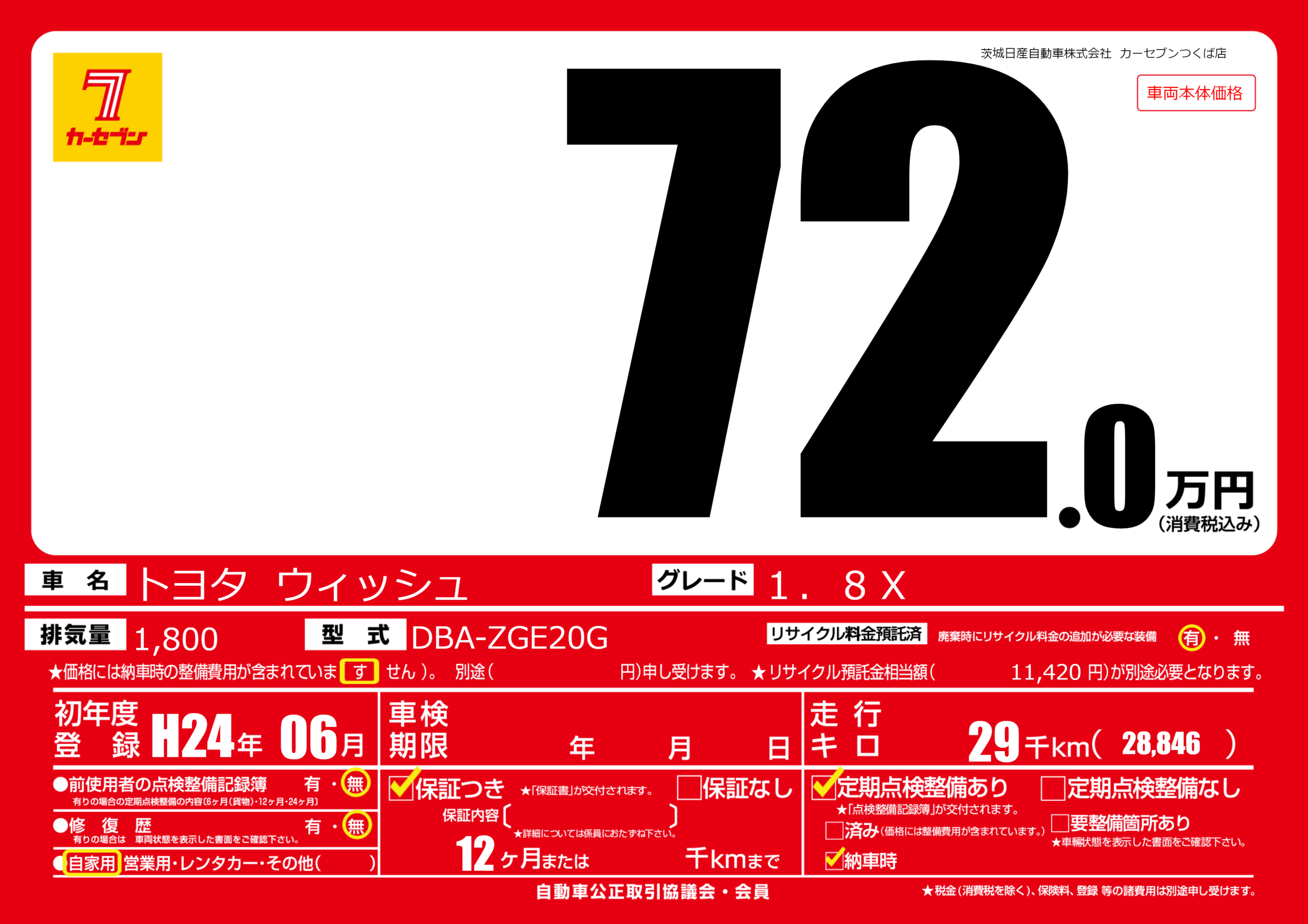 | 車名 | トヨタ ウィッシュ | グレード ミッション 排気量 |