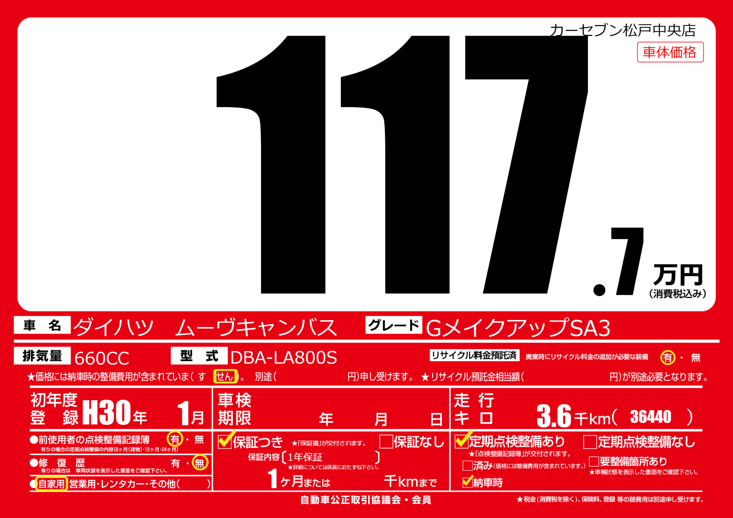 | 車名 | ダイハツ ムーヴキャンバス | グレード ミッション 排気量 |