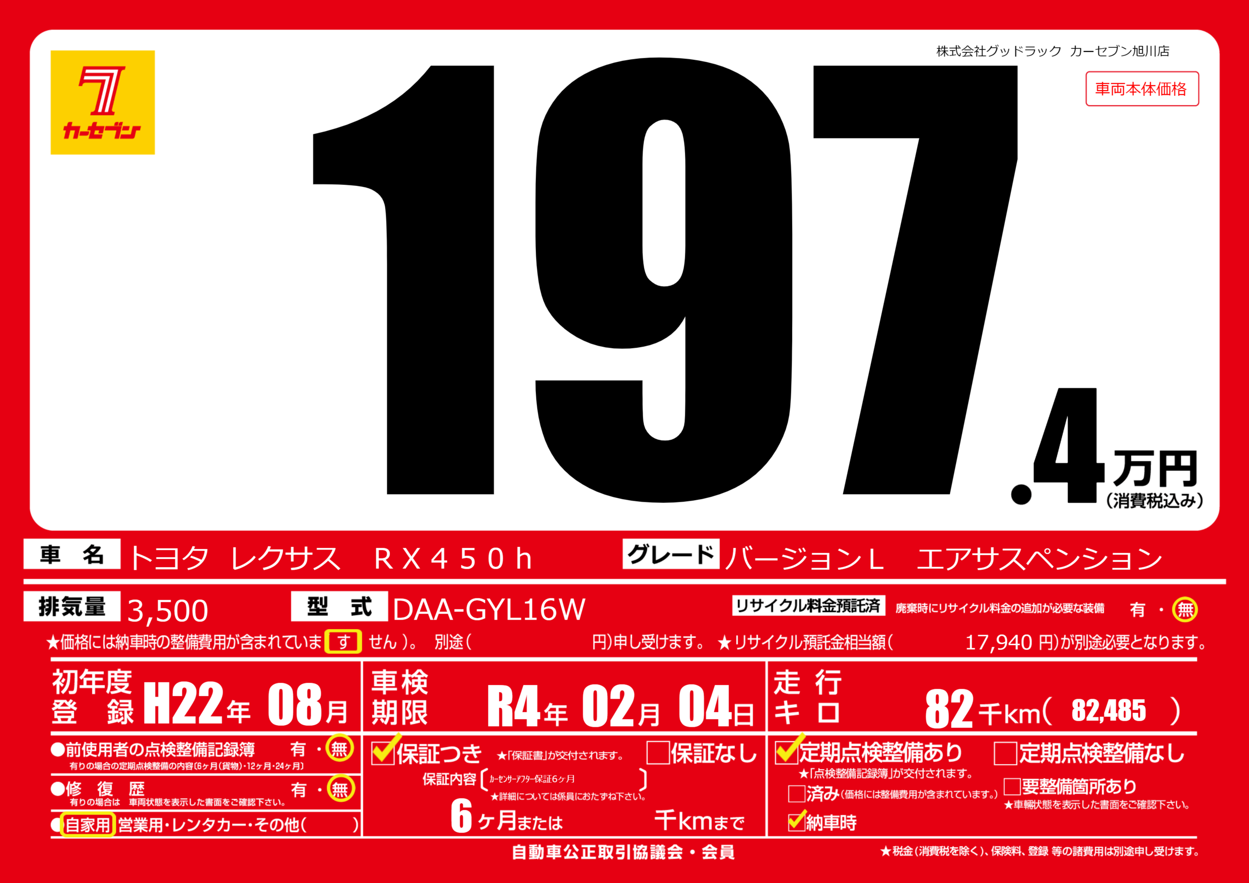 | 車名 | トヨタ レクサス RX450h | グレード ミッション 排気量 |