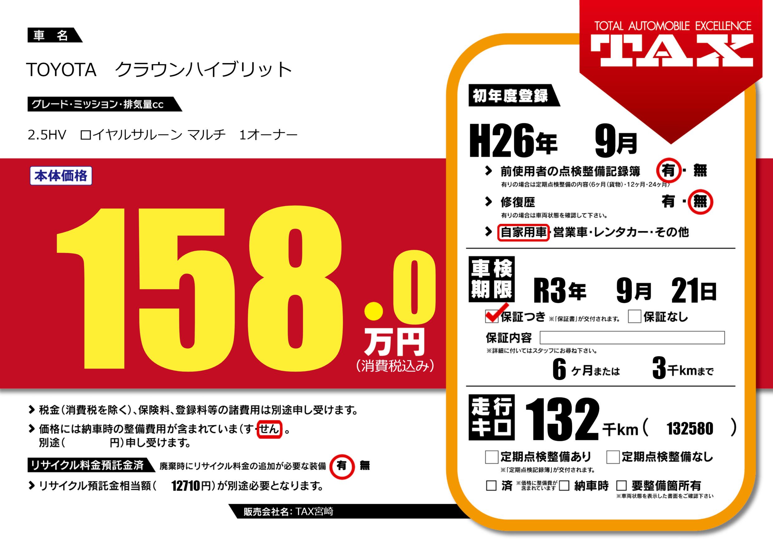| 車名 | TOYOTA クラウンハイブリット | グレード ミッション 排気量 |