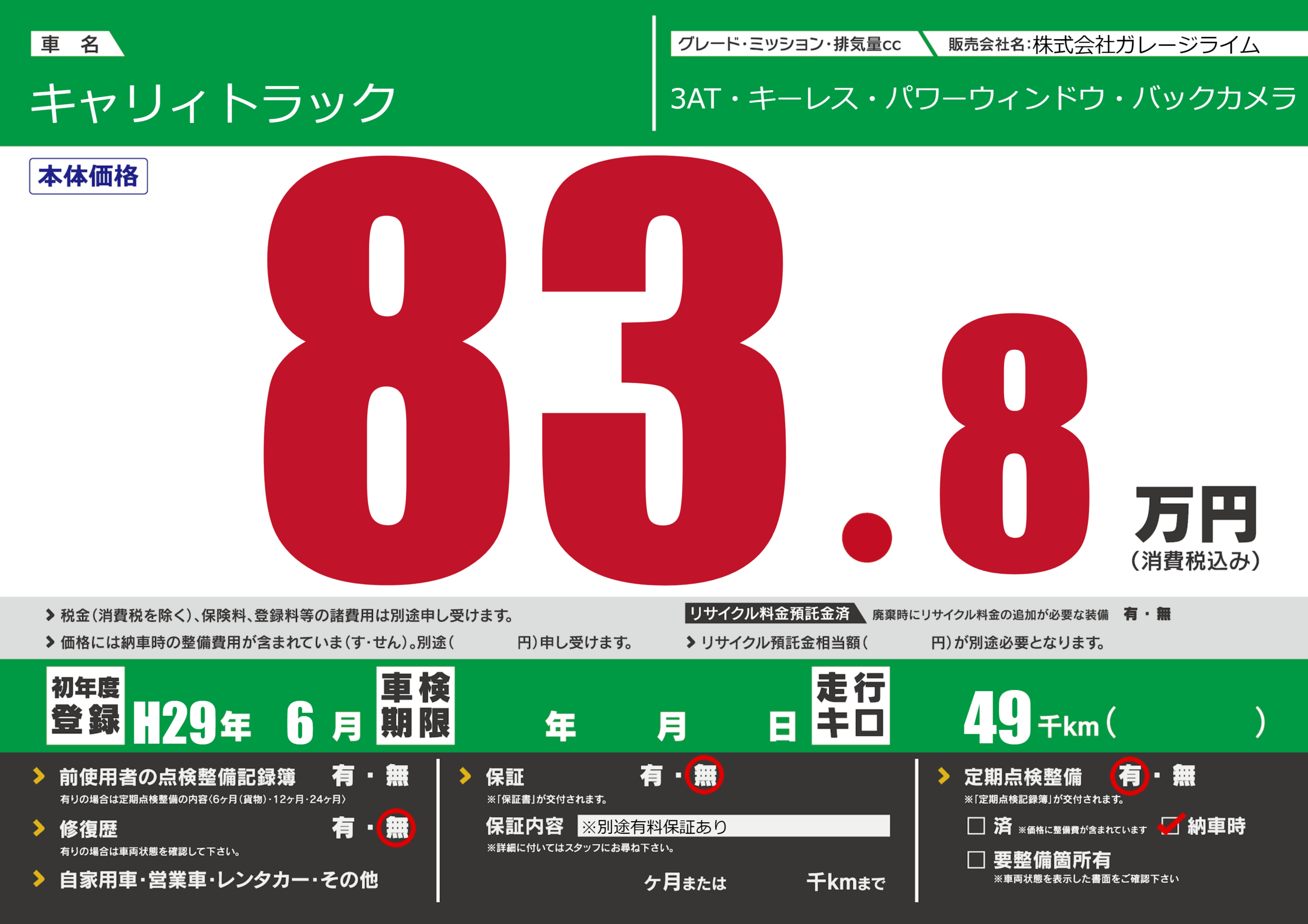 | 車名 | キャリィトラック | グレード ミッション 排気量 |