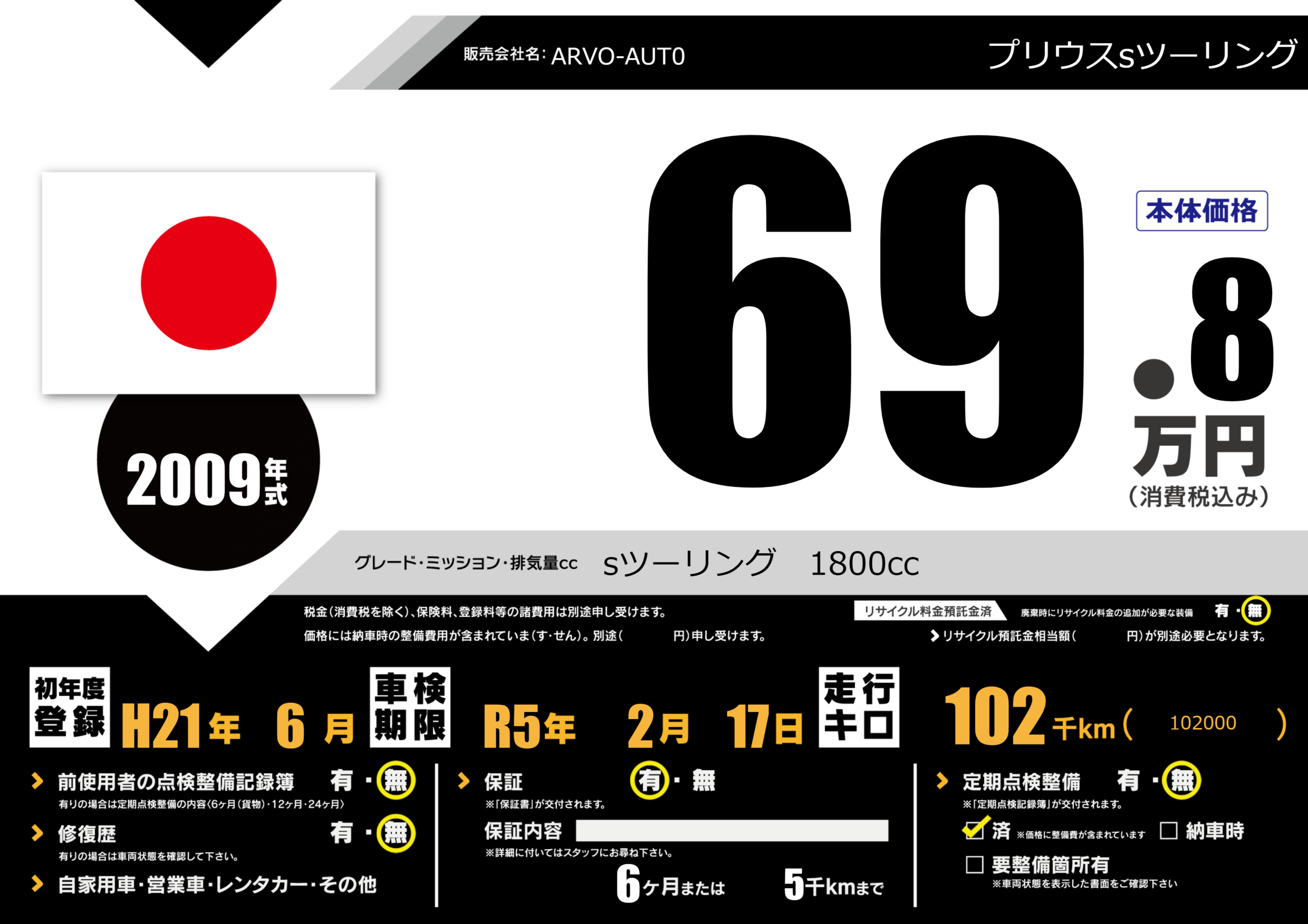 | 車名 | プリウスsツーリング | グレード ミッション 排気量 |