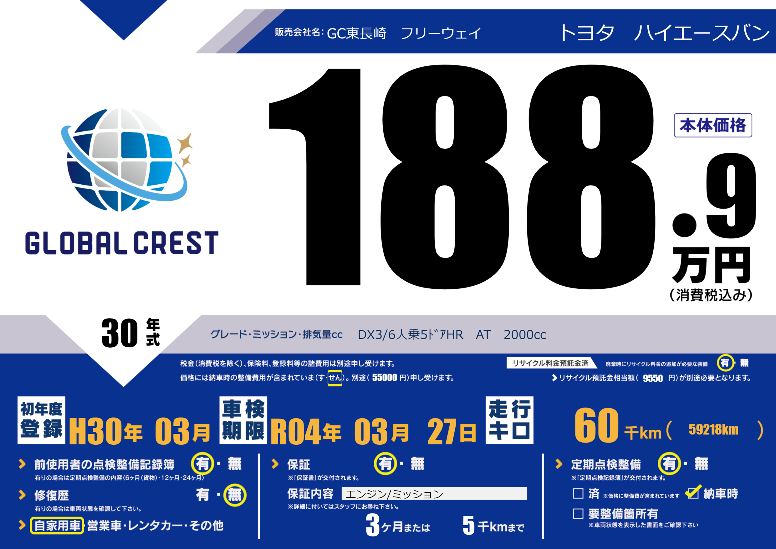 | 車名 | トヨタ ハイエースバン | グレード ミッション 排気量 |