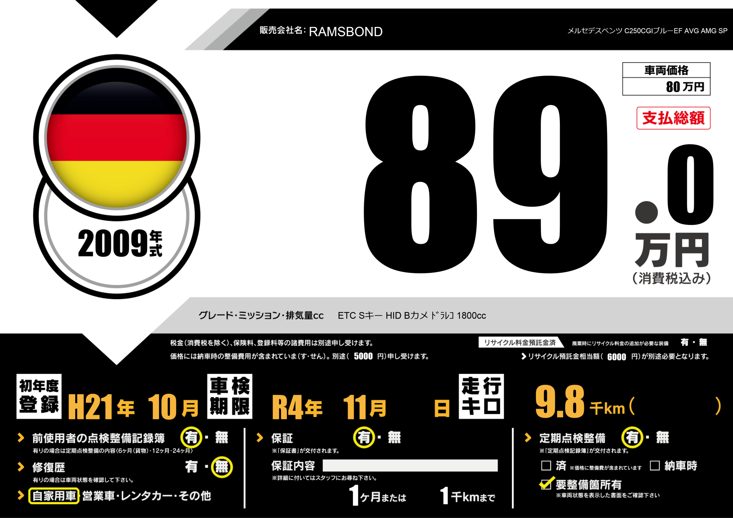 | 車名 | メルセデスベンツ C250CGIブルーEF AVG AMG SP | グレード ミッション 排気量 |