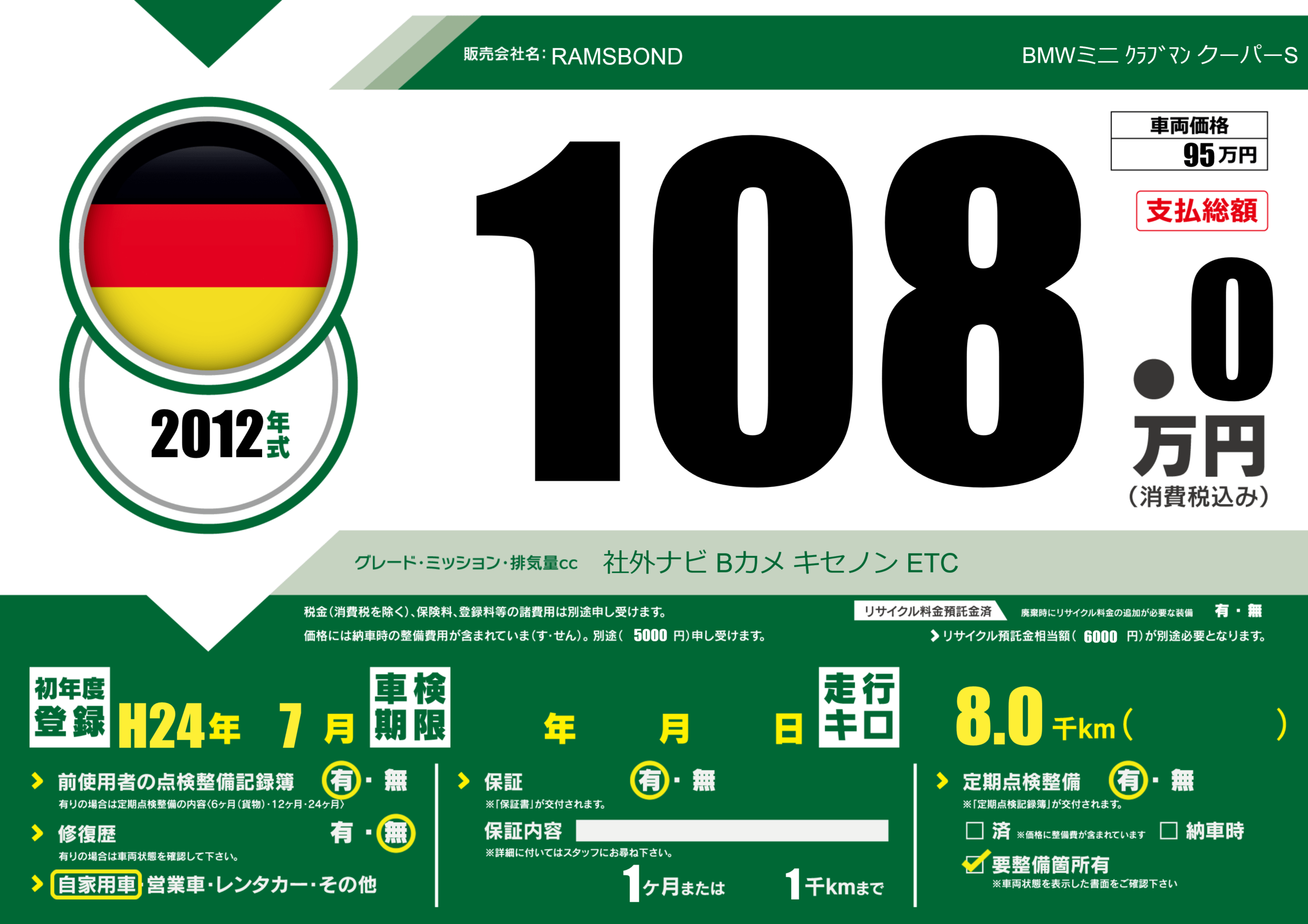 | 車名 | BMWミニ クラブマン クーパーS | グレード ミッション 排気量 |