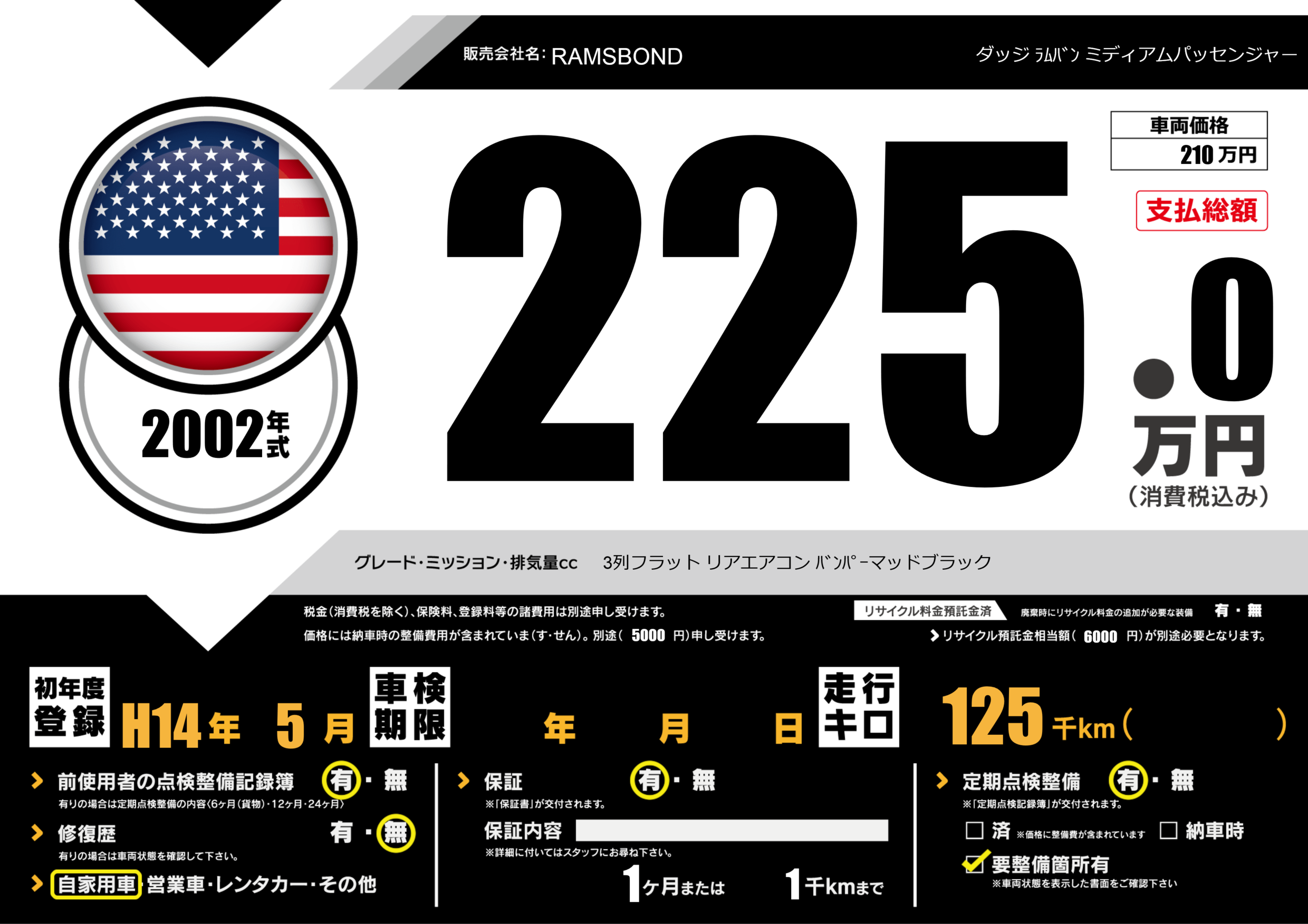 | 車名 | ダッジ ラムバン ミディアムパッセンジャー | グレード ミッション 排気量 |