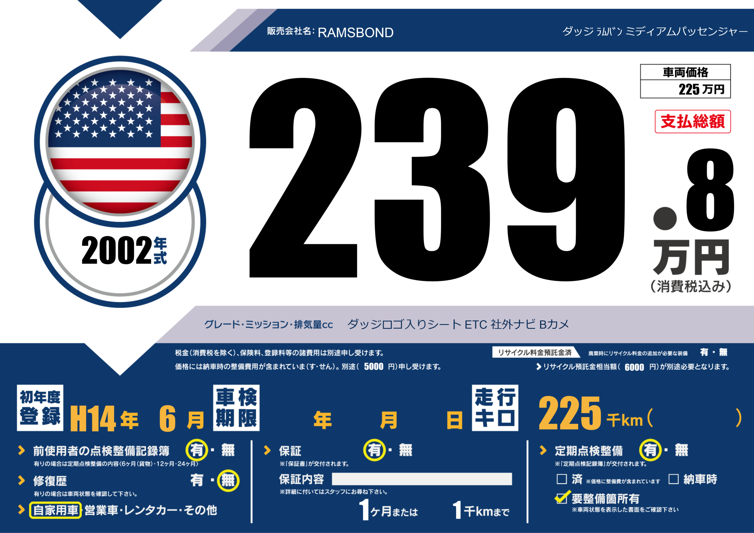 | 走行キロ | 22.5万km | 初年度登録 | H14年6月 |