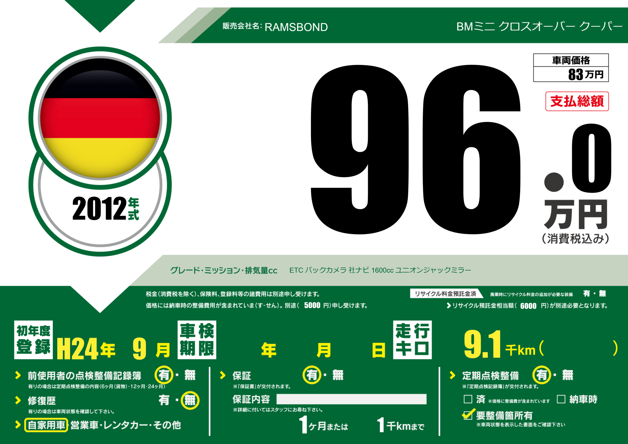 | 車名 | BMミニ クロスオーバー クーパー | グレード ミッション 排気量 |