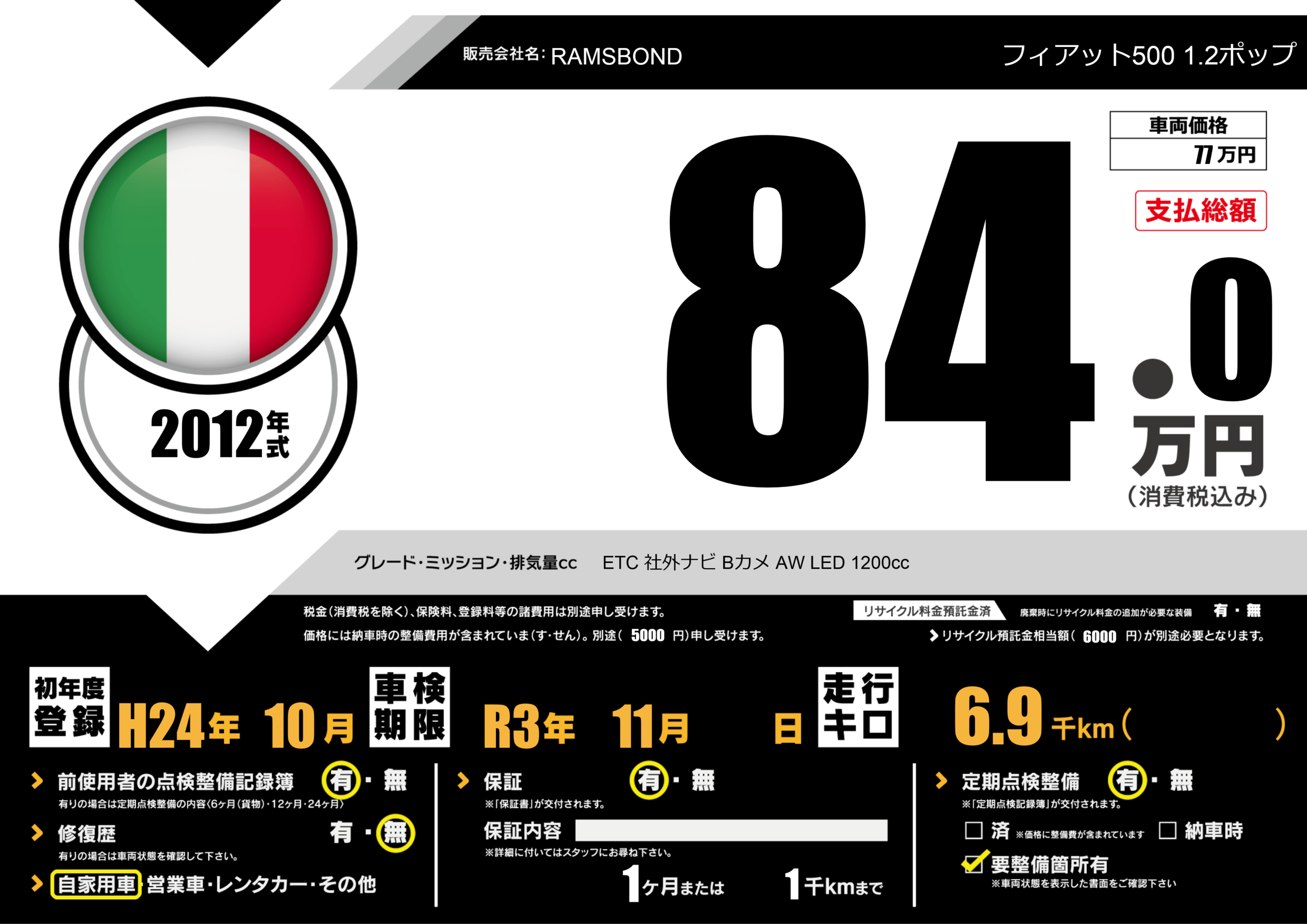 | 車名 | フィアット500 1.2ポップ | グレード ミッション 排気量 |