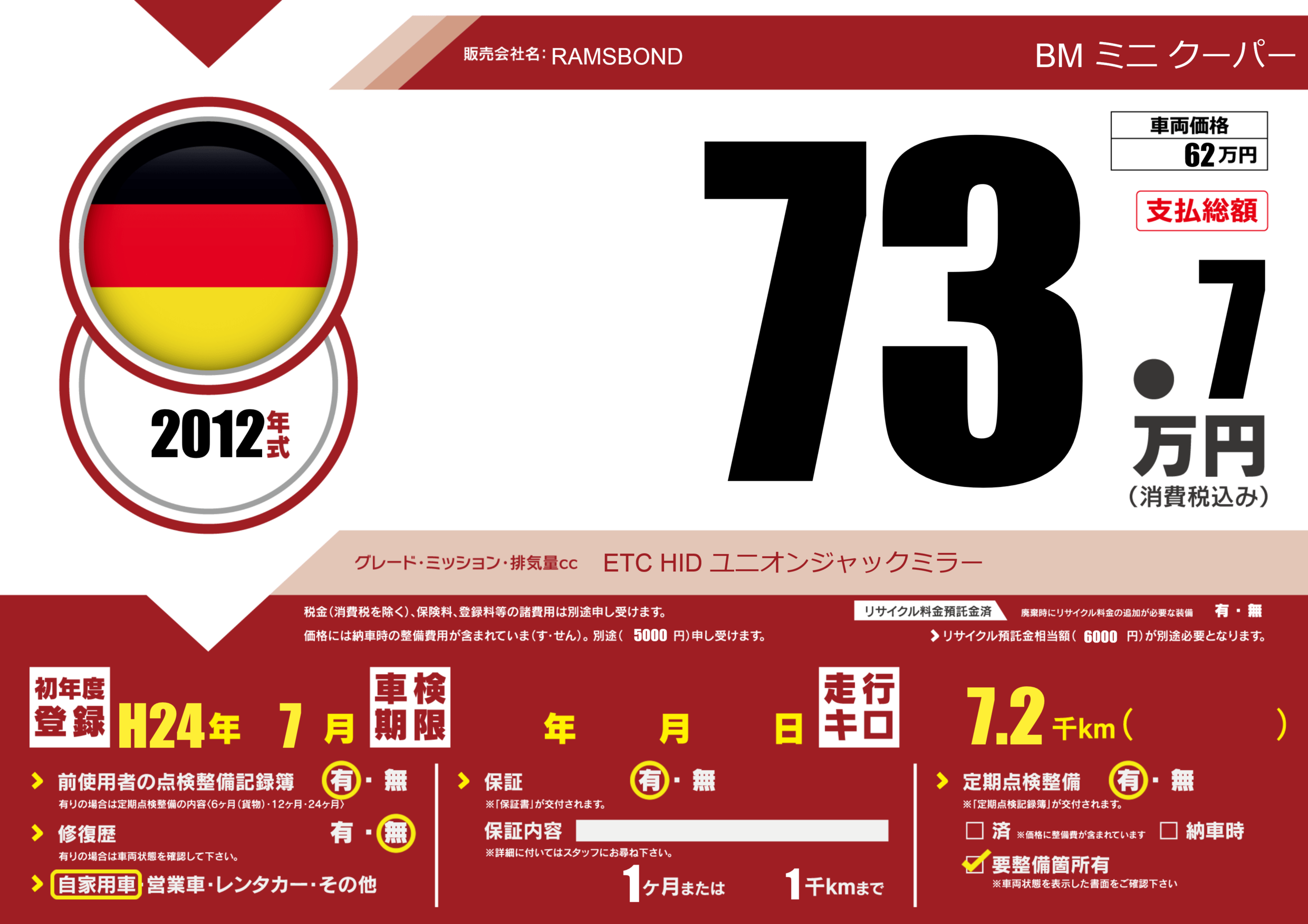 | 車名 | BM ミニ クーパー | グレード ミッション 排気量 |