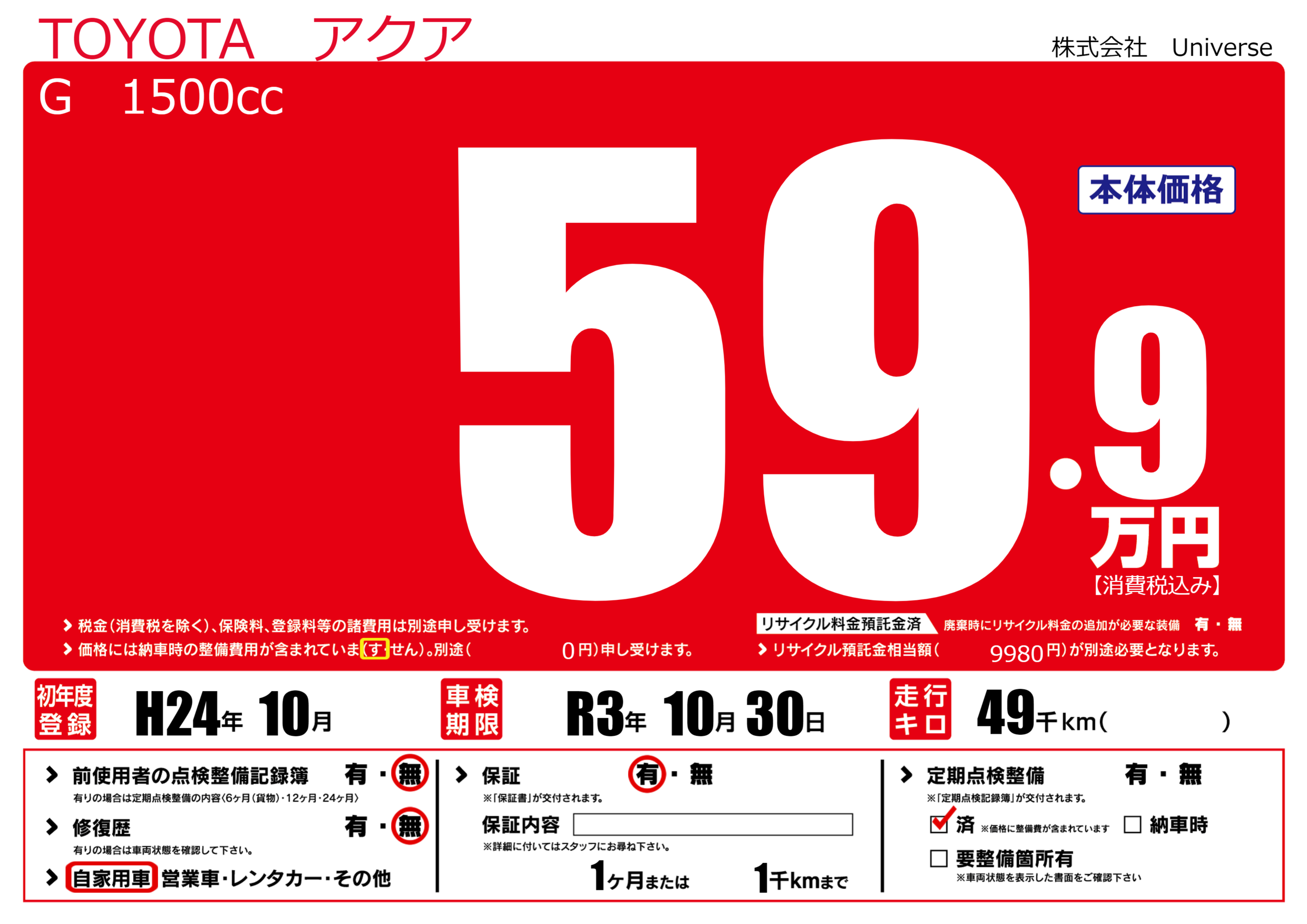 | 定期点検整備 | 定期点検整備済み | ||