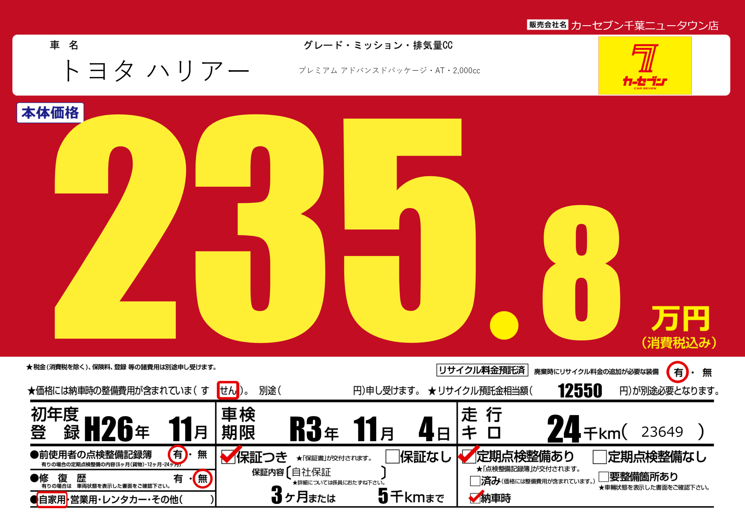 | 車名 | トヨタ ハリアー | グレード ミッション 排気量 |