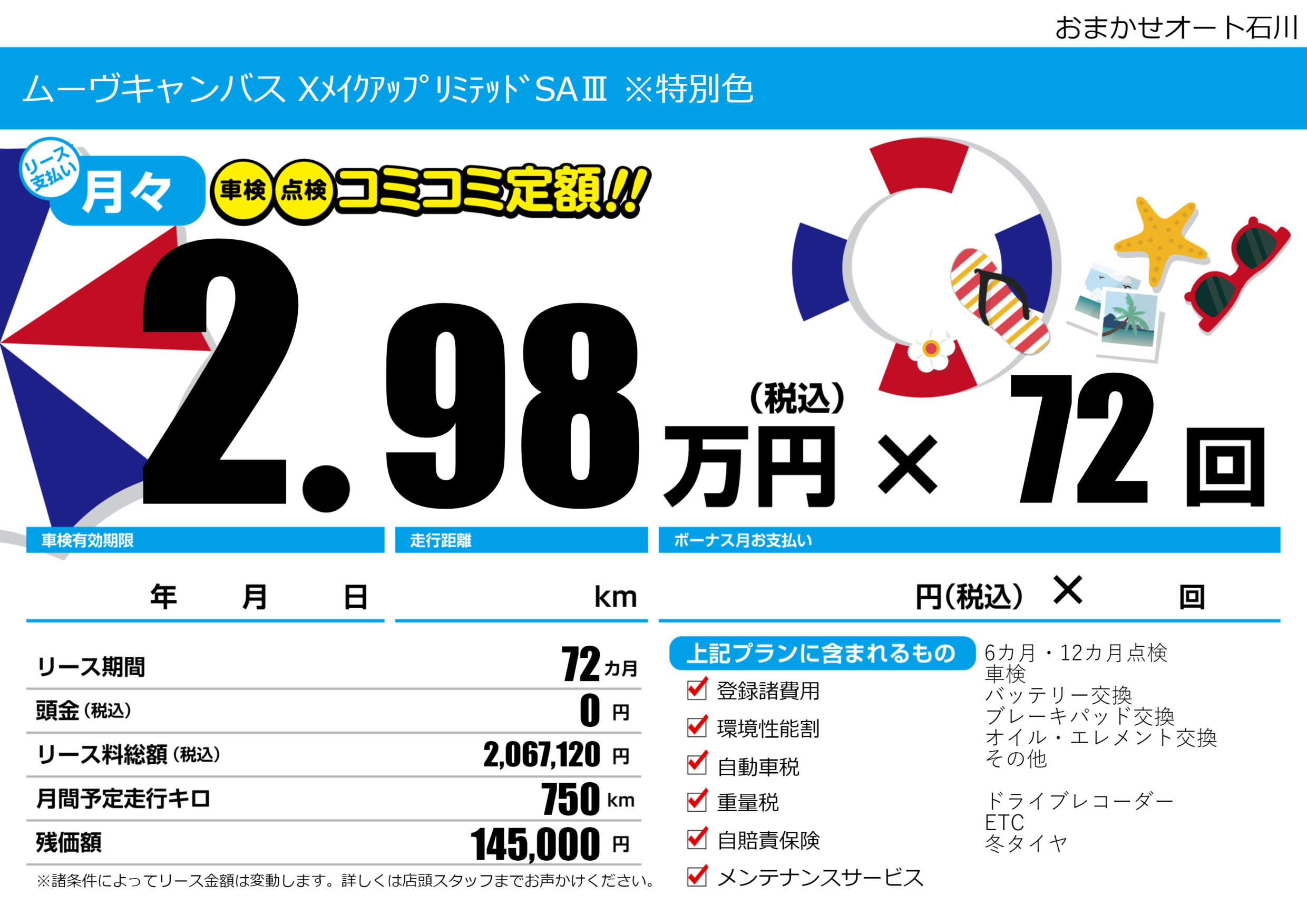 | 車名 | ムーヴキャンバス XメイクアップリミテッドSAⅢ ※特別色 | グレード ミッション 排気量 |