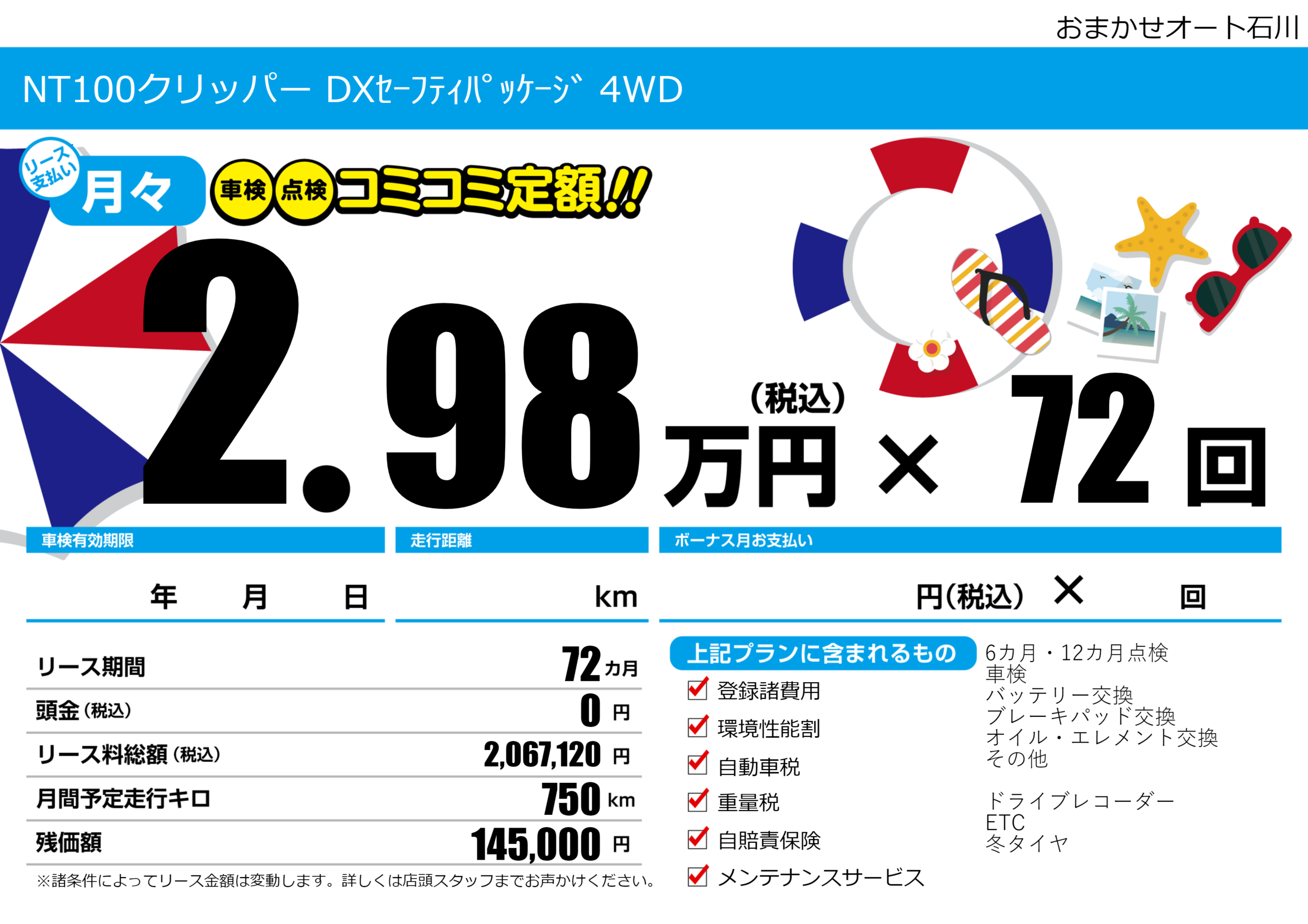 | 車名 | NT100クリッパー DXセーフティパッケージ 4WD | グレード ミッション 排気量 |