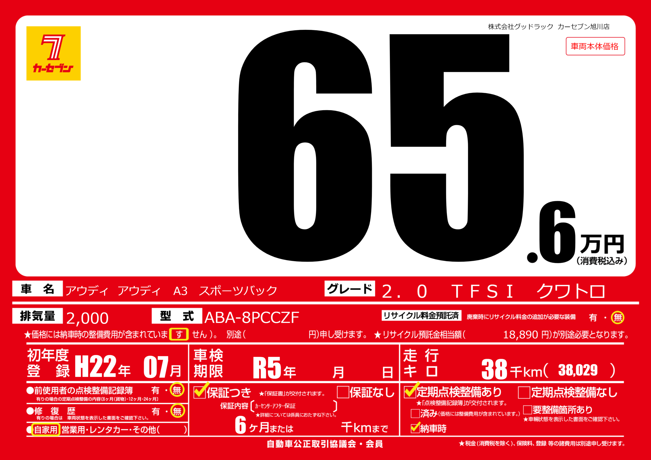 | 走行キロ | 3.8万km | 初年度登録 | H22年07月 |