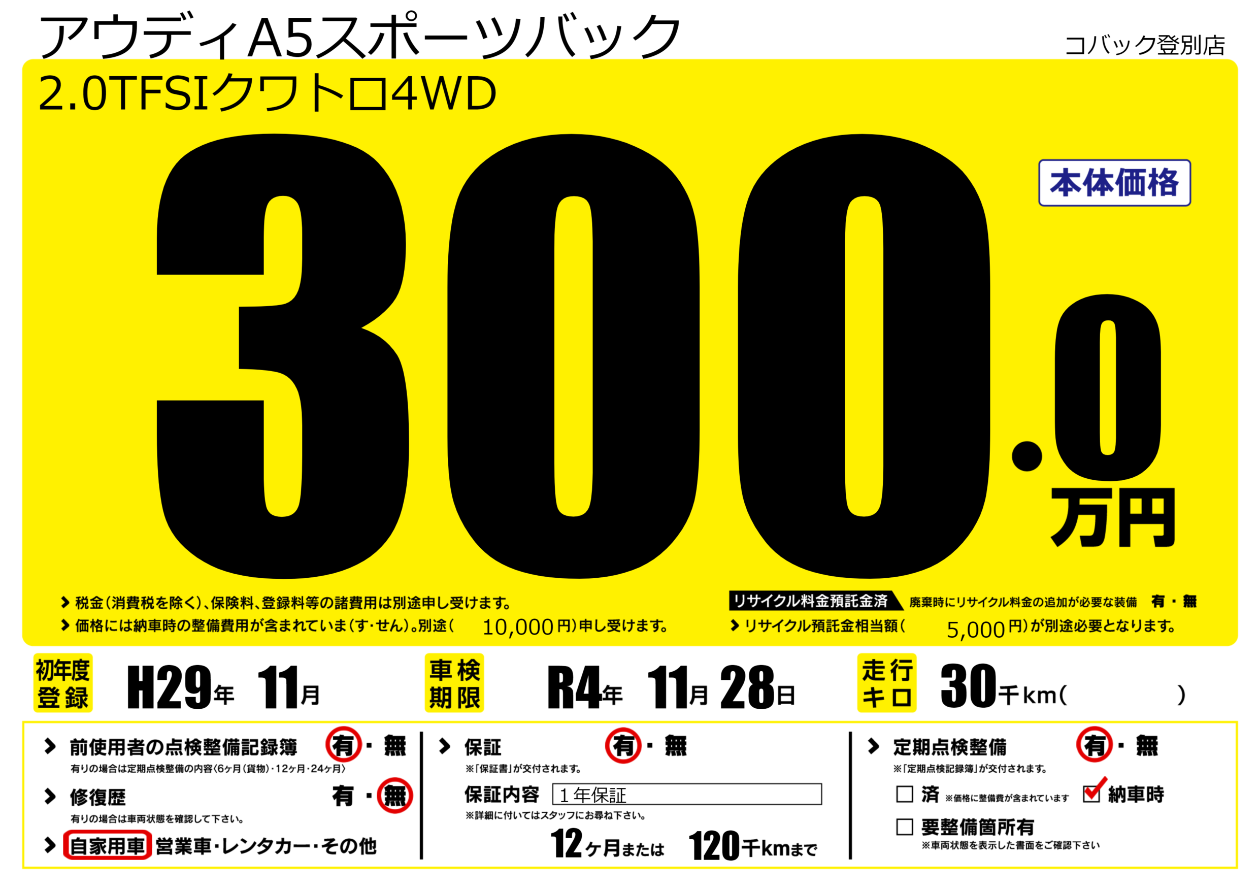 | 走行キロ | 3万km | 初年度登録 | H29年11月 |